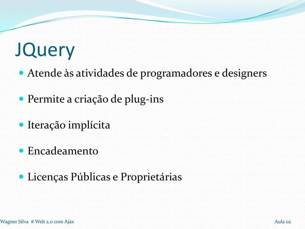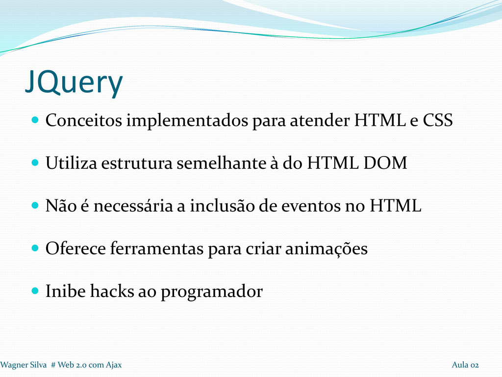 Utiliza estrutura semelhante à do HTML DOM Não é necessária a inclusão de eventos no HTML Oferece ferramentas para criar animações Inibe hacks ao programador Wagner Silva # Web 2.0 com Ajax Aula 02