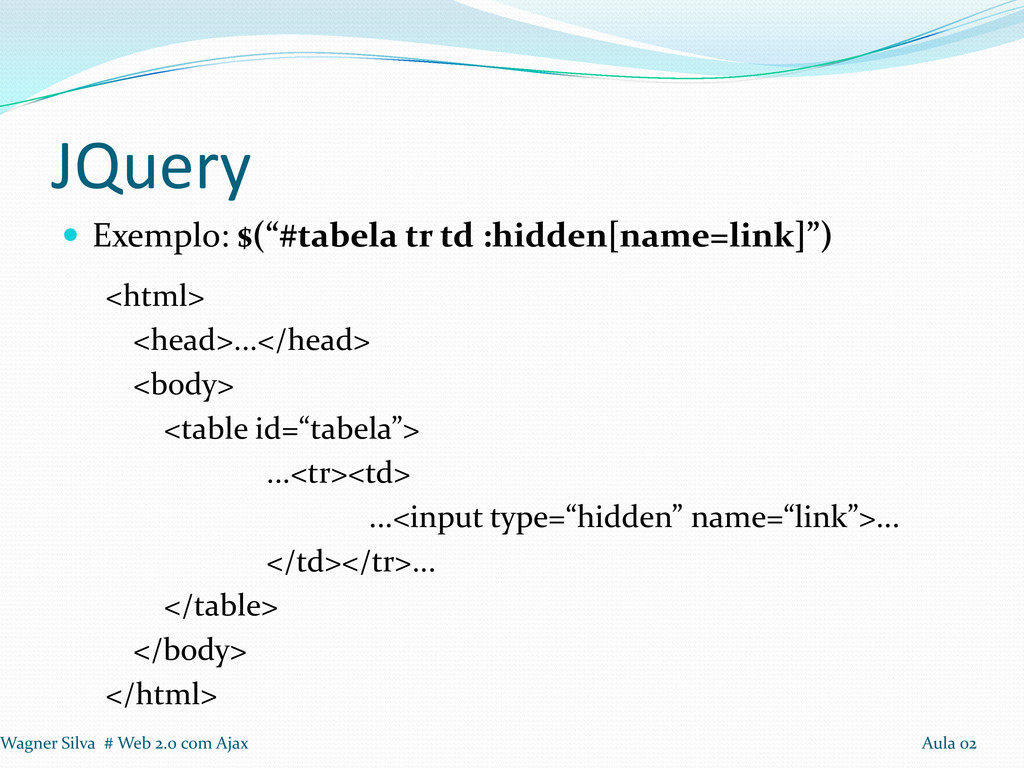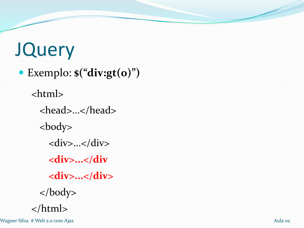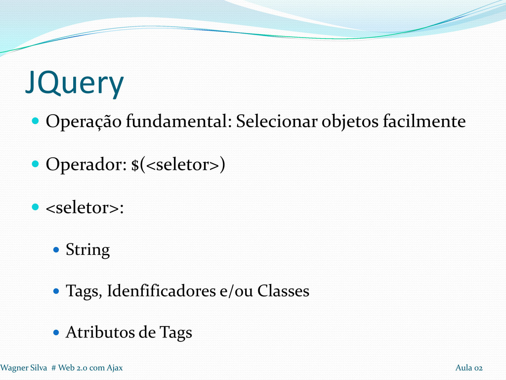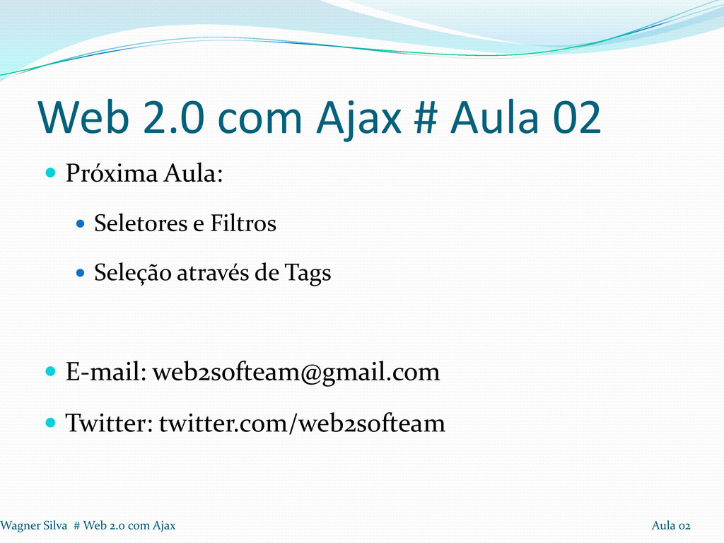 usuário clicar em enviar, se os campos obrigatórios estiverem preenchidos, a parece a mensagem de sucesso. 1º Passo: Incluir a biblioteca JQuery 2º Passo: Na função javaScript, adicionar $(document).ready(function(){...}); 3º Passo: Modificar a função que modifica o html para o padrão JQuery. Wagner Silva # Web 2.0 com Ajax Aula 02
