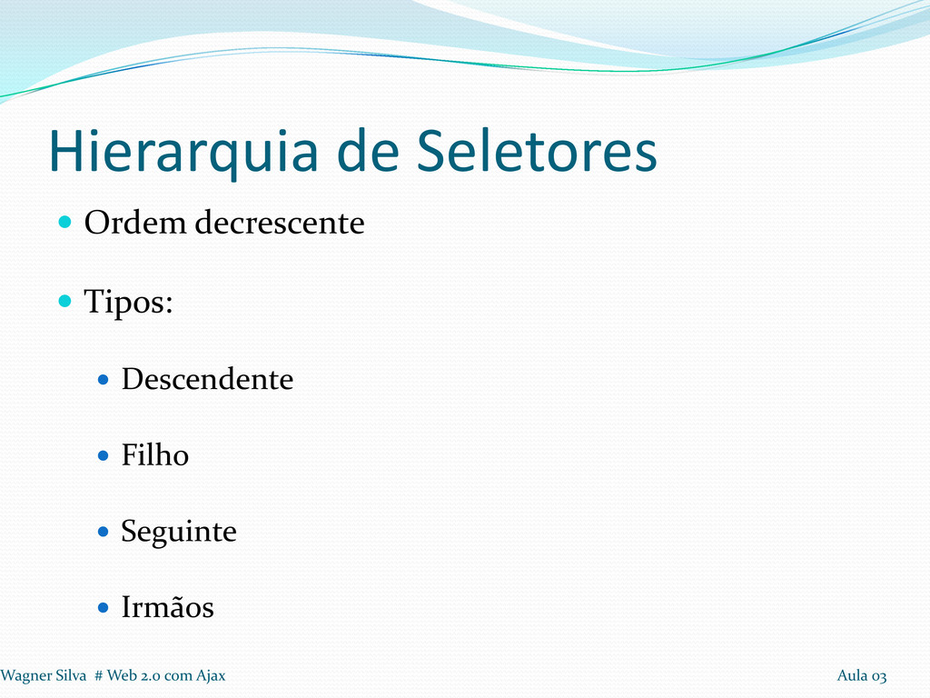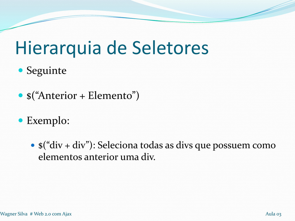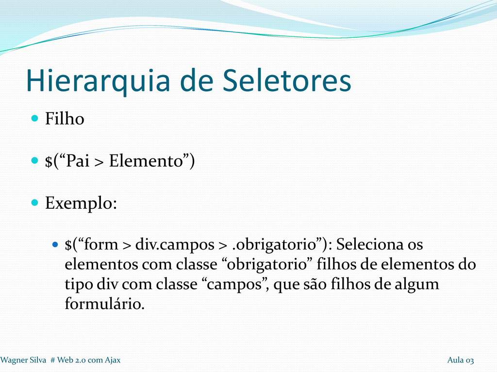 Exemplo: $(“form > div.campos > .obrigatorio”): Seleciona os elementos com classe “obrigatorio” filhos de elementos do tipo div com classe “campos”, que são filhos de algum formulário. Wagner Silva # Web 2.0 com Ajax Aula 03