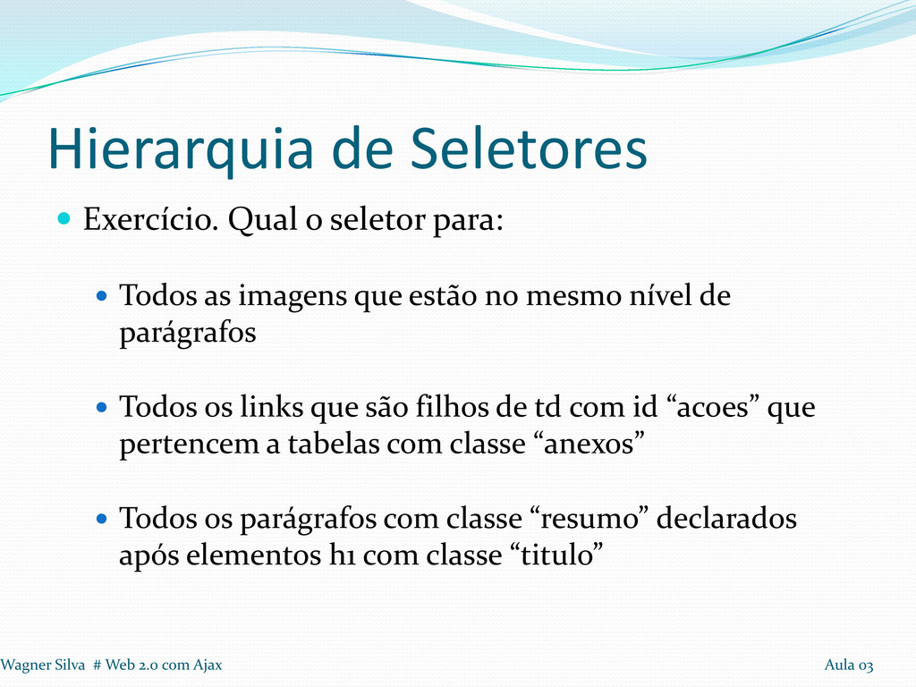 Todos as imagens que estão no mesmo nível de parágrafos Todos os links que são filhos de td com id “acoes” que pertencem a tabelas com classe “anexos” Todos os parágrafos com classe “resumo” declarados após elementos h1 com classe “titulo” Wagner Silva # Web 2.0 com Ajax Aula 03