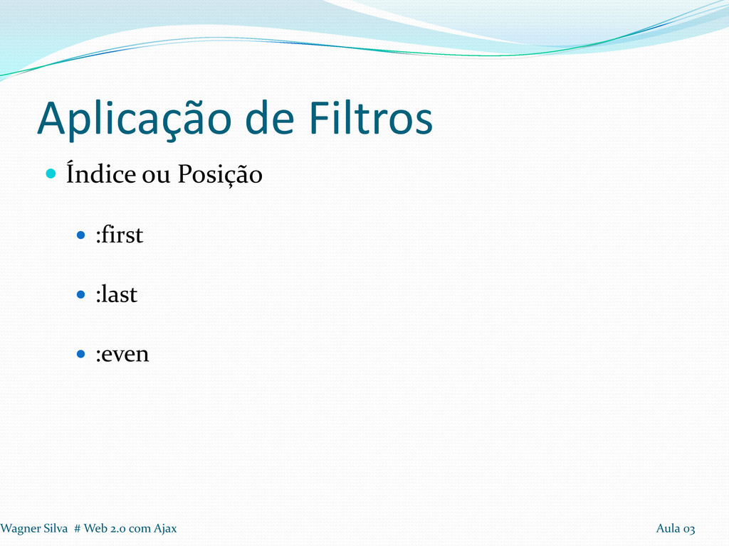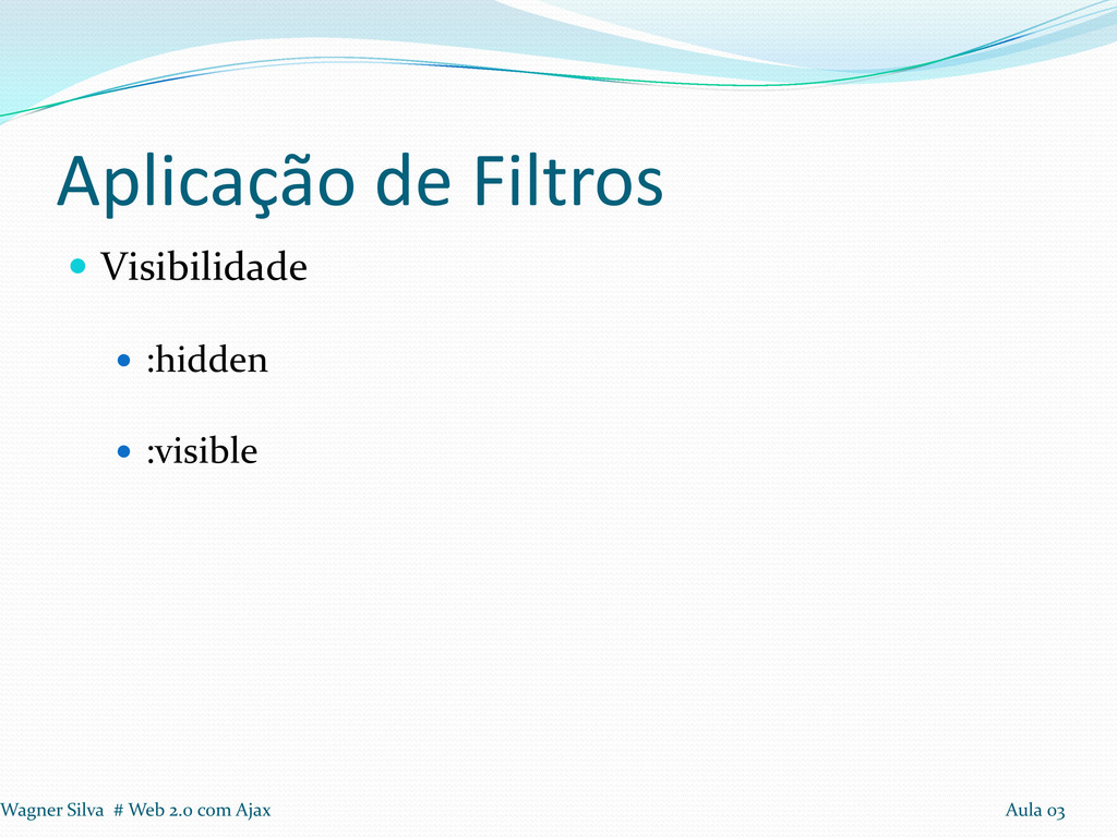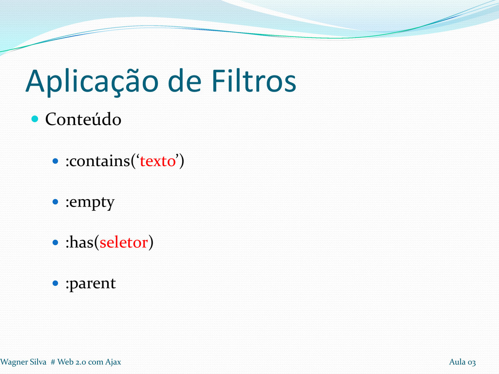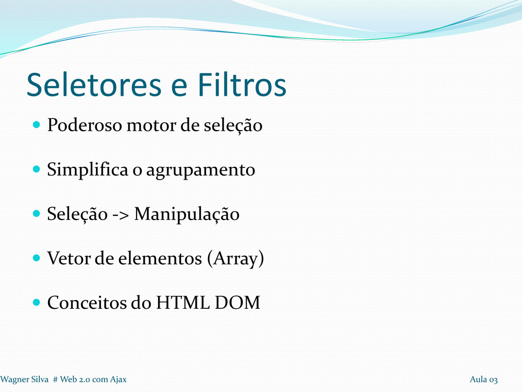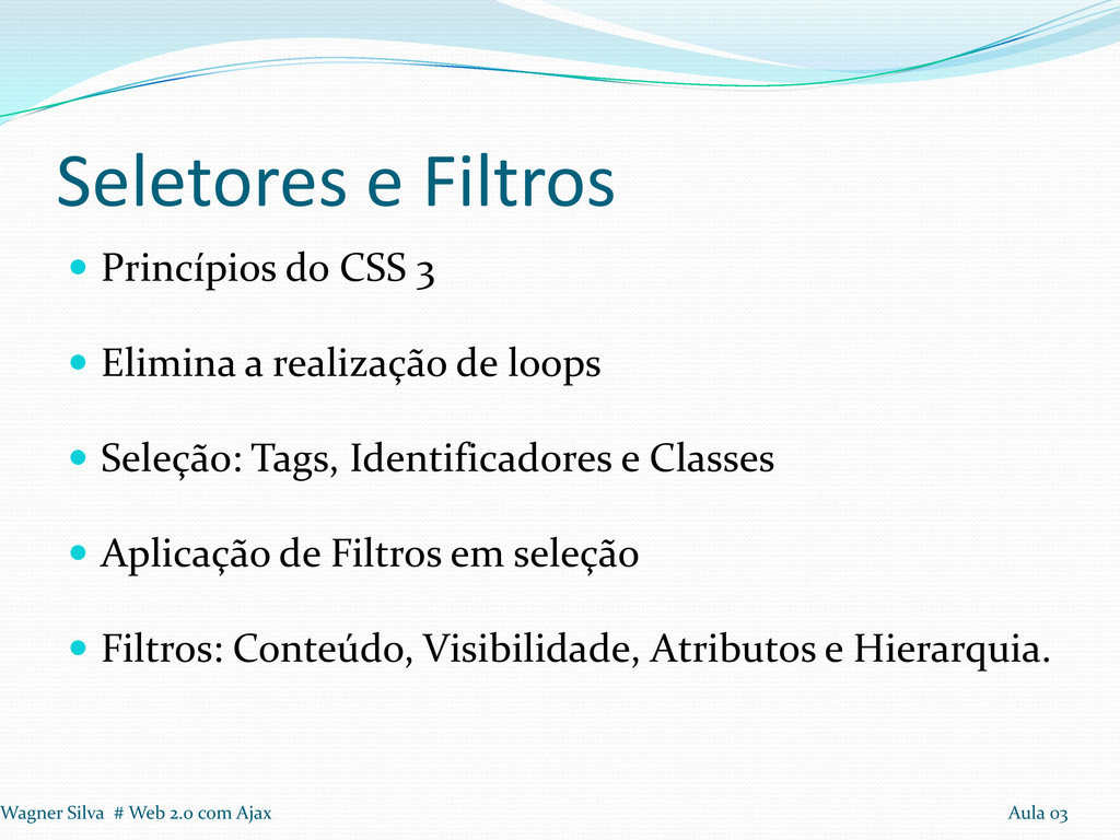 a realização de loops Seleção: Tags, Identificadores e Classes Aplicação de Filtros em seleção Filtros: Conteúdo, Visibilidade, Atributos e Hierarquia. Wagner Silva # Web 2.0 com Ajax Aula 03
