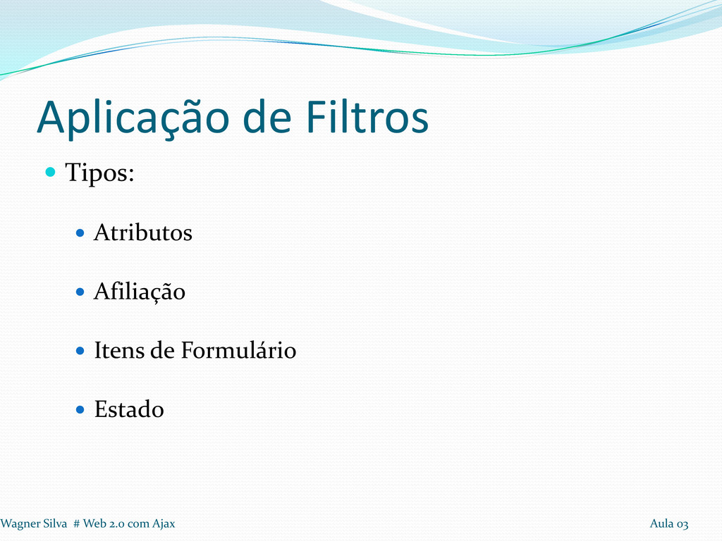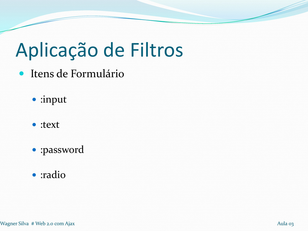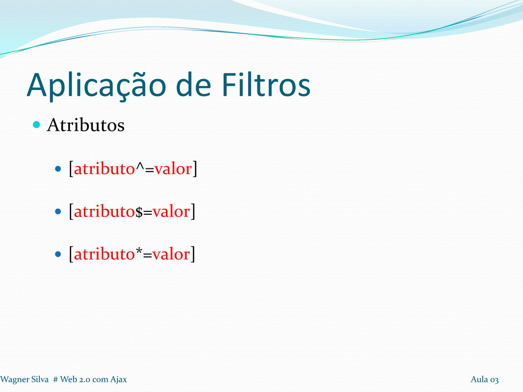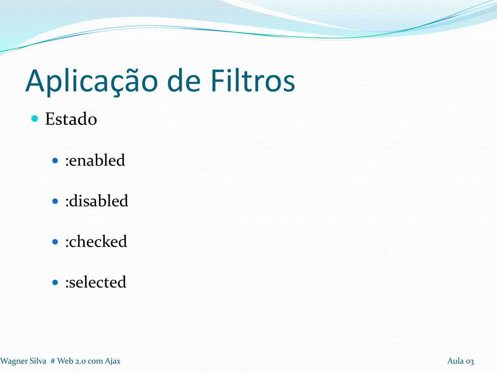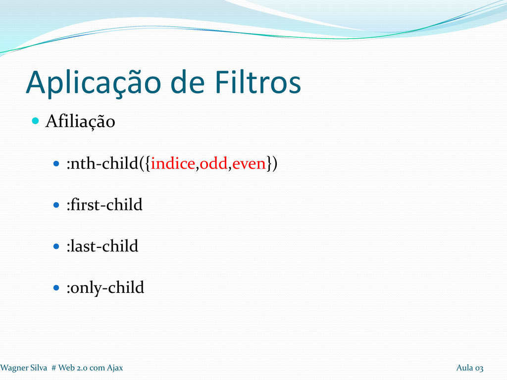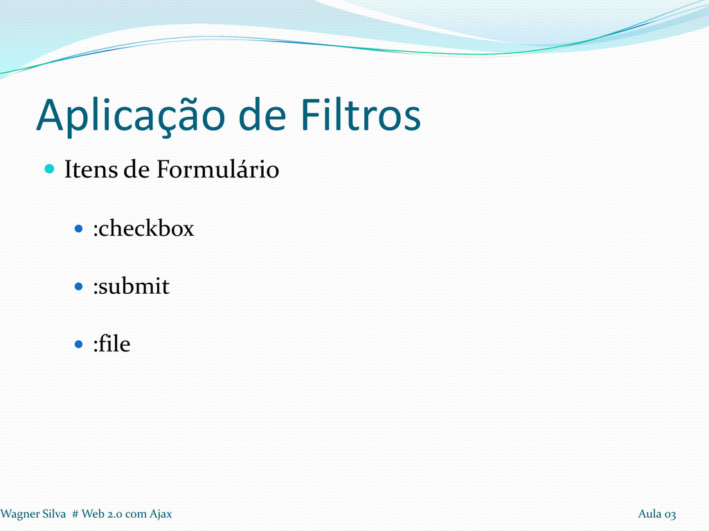 a realização de loops Seleção: Tags, Identificadores e Classes Aplicação de Filtros em seleção Filtros: Conteúdo, Visibilidade, Atributos e Hierarquia. Wagner Silva # Web 2.0 com Ajax Aula 03
