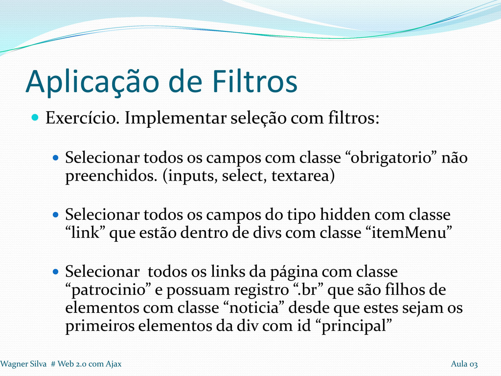 Selecionar todos os campos com classe “obrigatorio” não preenchidos. (inputs, select, textarea) Selecionar todos os campos do tipo hidden com classe “link” que estão dentro de divs com classe “itemMenu” Selecionar todos os links da página com classe “patrocinio” e possuam registro “.br” que são filhos de elementos com classe “noticia” desde que estes sejam os primeiros elementos da div com id “principal” Wagner Silva # Web 2.0 com Ajax Aula 03