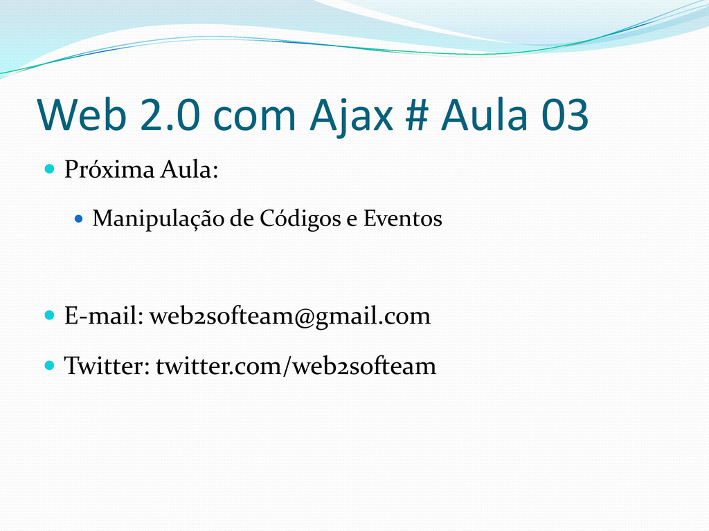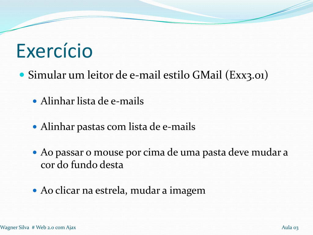 Alinhar lista de e-mails Alinhar pastas com lista de e-mails Ao passar o mouse por cima de uma pasta deve mudar a cor do fundo desta Ao clicar na estrela, mudar a imagem Wagner Silva # Web 2.0 com Ajax Aula 03
