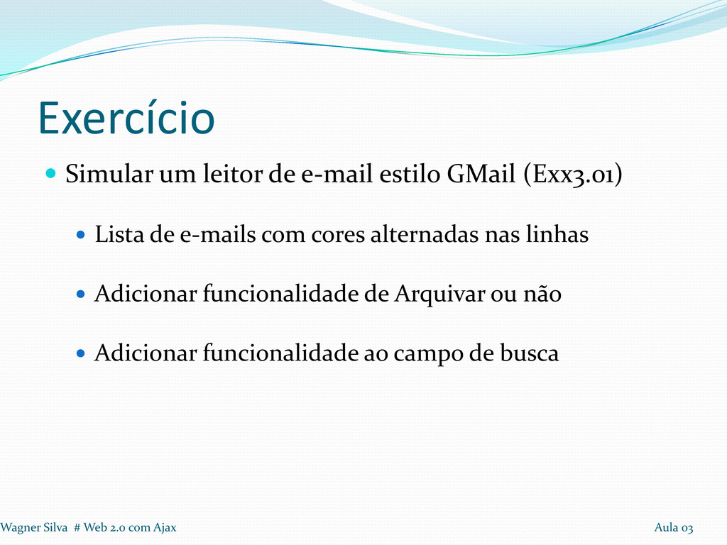 Lista de e-mails com cores alternadas nas linhas Adicionar funcionalidade de Arquivar ou não Adicionar funcionalidade ao campo de busca Wagner Silva # Web 2.0 com Ajax Aula 03