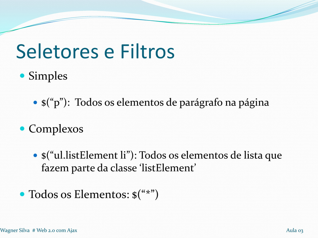 de parágrafo na página Complexos $(“ul.listElement li”): Todos os elementos de lista que fazem parte da classe ‘listElement’ Todos os Elementos: $(“*”) Wagner Silva # Web 2.0 com Ajax Aula 03
