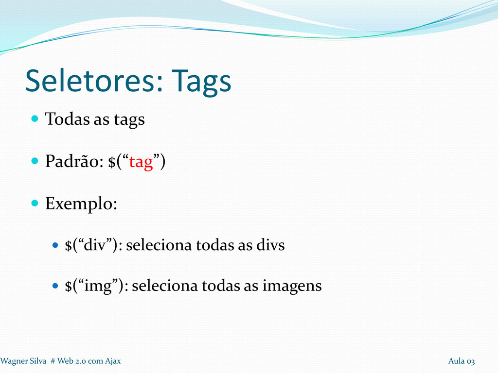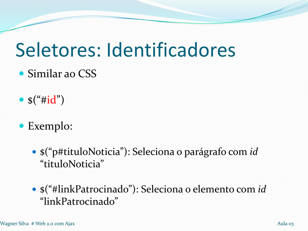 $(“p#tituloNoticia”): Seleciona o parágrafo com id “tituloNoticia” $(“#linkPatrocinado”): Seleciona o elemento com id “linkPatrocinado” Wagner Silva # Web 2.0 com Ajax Aula 03