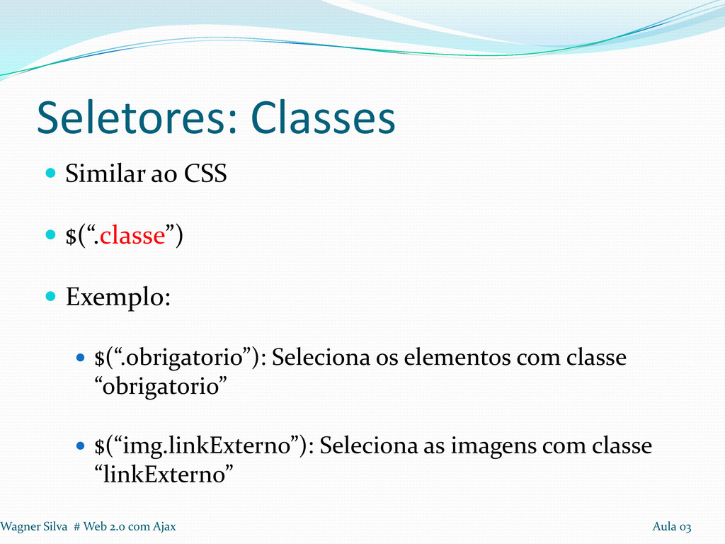 $(“.obrigatorio”): Seleciona os elementos com classe “obrigatorio” $(“img.linkExterno”): Seleciona as imagens com classe “linkExterno” Wagner Silva # Web 2.0 com Ajax Aula 03