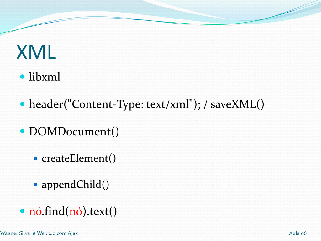 createElement() appendChild() nó.find(nó).text() Wagner Silva # Web 2.0 com Ajax Aula 06