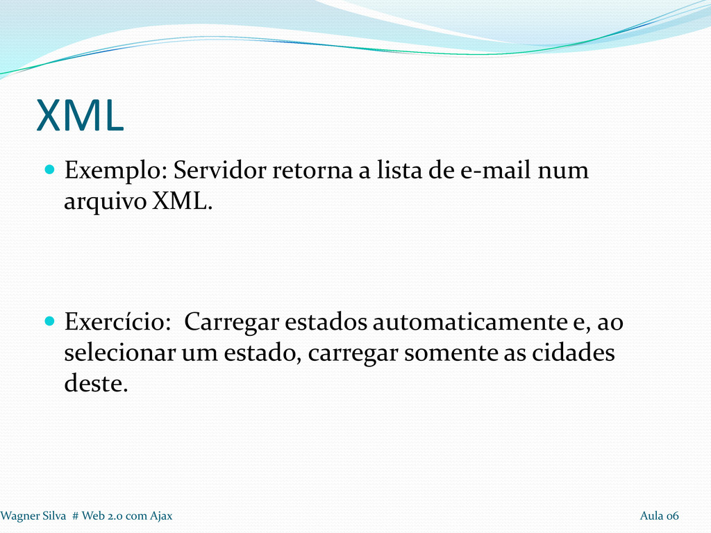 arquivo XML. Exercício: Carregar estados automaticamente e, ao selecionar um estado, carregar somente as cidades deste. Wagner Silva # Web 2.0 com Ajax Aula 06