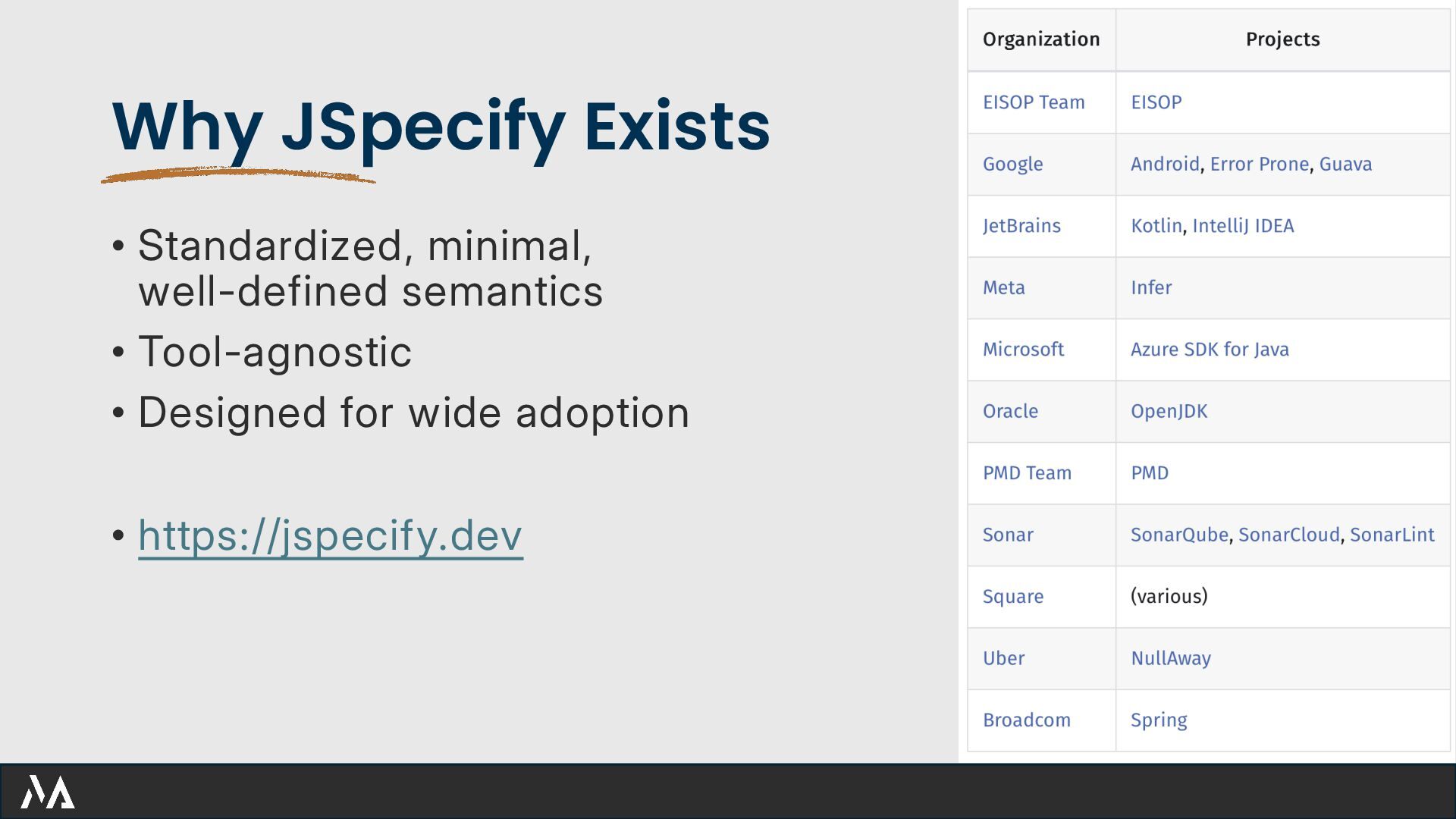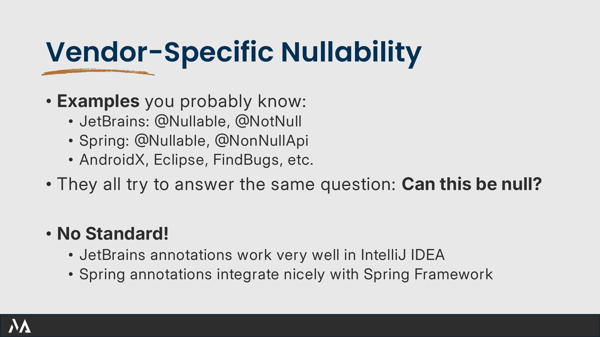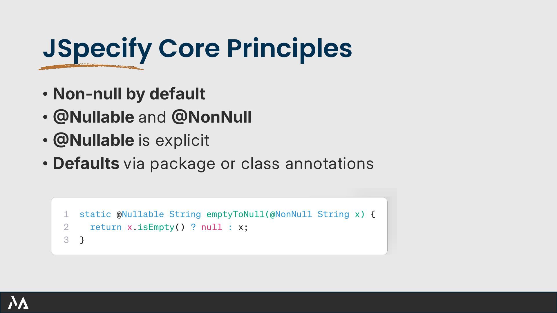 First, we'll look at what JSpecify is and how it differs from other nullability annotations like JetBrains' @Nullable or JSR-305.
