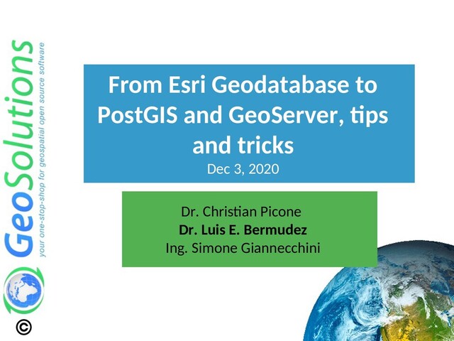 The Webinar will cover tips and tricks to export Esri Geodatabases to PostGIS and serving them via GeoServer levering GeoPackage and QGIS Graphical Modeler. A presentation and a demo will be given by Christian Picone, lead engineer at GeoSolutions.