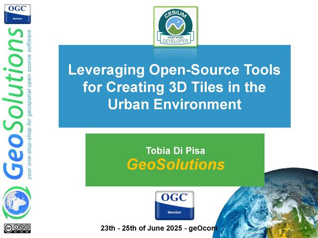 2025 - geOcom • Ongoing work to integrate support for extensive 3D Tile Mesh processing pipelines Main objectives: ◦ Metadata extraction, inspection and photogrammetry outline ◦ Sparse & Dense Point clouds generation from images ◦ 3D Mesh generation ◦ Texturing ◦ Tiling strategies for the purpose Main challenges: ◦ Use Open Source tools ◦ HW capabilities and costs ◦ Find balance between quality and processing time ◦ Performing result Q3 New RC in Autumn 2025!