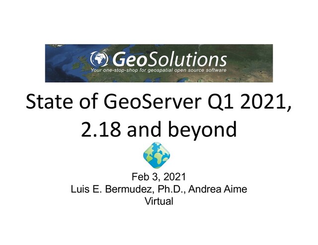 Webinar from GeoSolutions on GeoServer 2.18 and the coming 2.19: Improvements on raster analysis, GeoPackage metadata and styles, S3 COG support and more. We will have a 30 minutes presentation and 30 minutes of Q&A with our lead GeoServer developer, Andrea Aime.