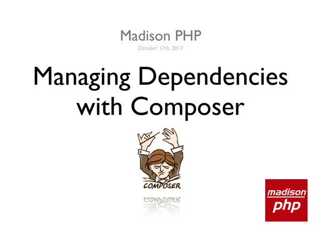 Does your project rely on third-party code? Does your company share code between multiple projects? If so, you have dealt with dependencies. Traditionally, there have been many ways to manage dependencies for PHP projects: PEAR, copying and pasting, ZIP archives, Subversion exports, Git submodules, or complicated build scripts. Composer, a dependency manager for PHP, aims to make the whole process more streamlined. Learn how Composer can be used to manage third-party packages, how to create and distribute your own Composer packages, and how Composer can change the way you think about code reuse.