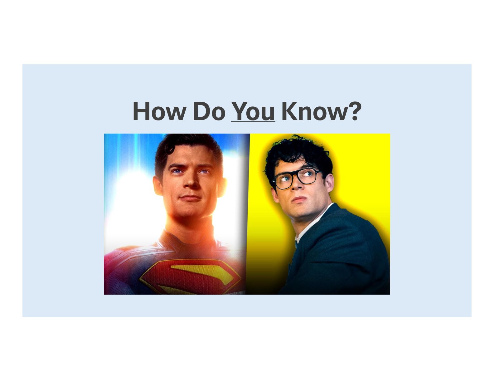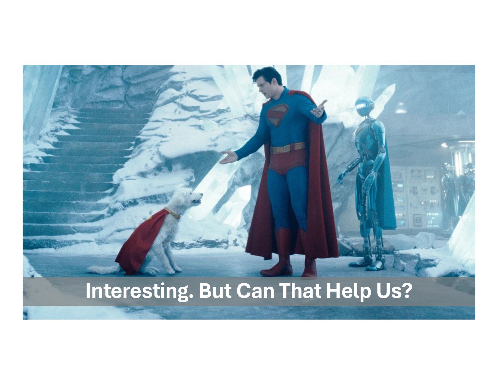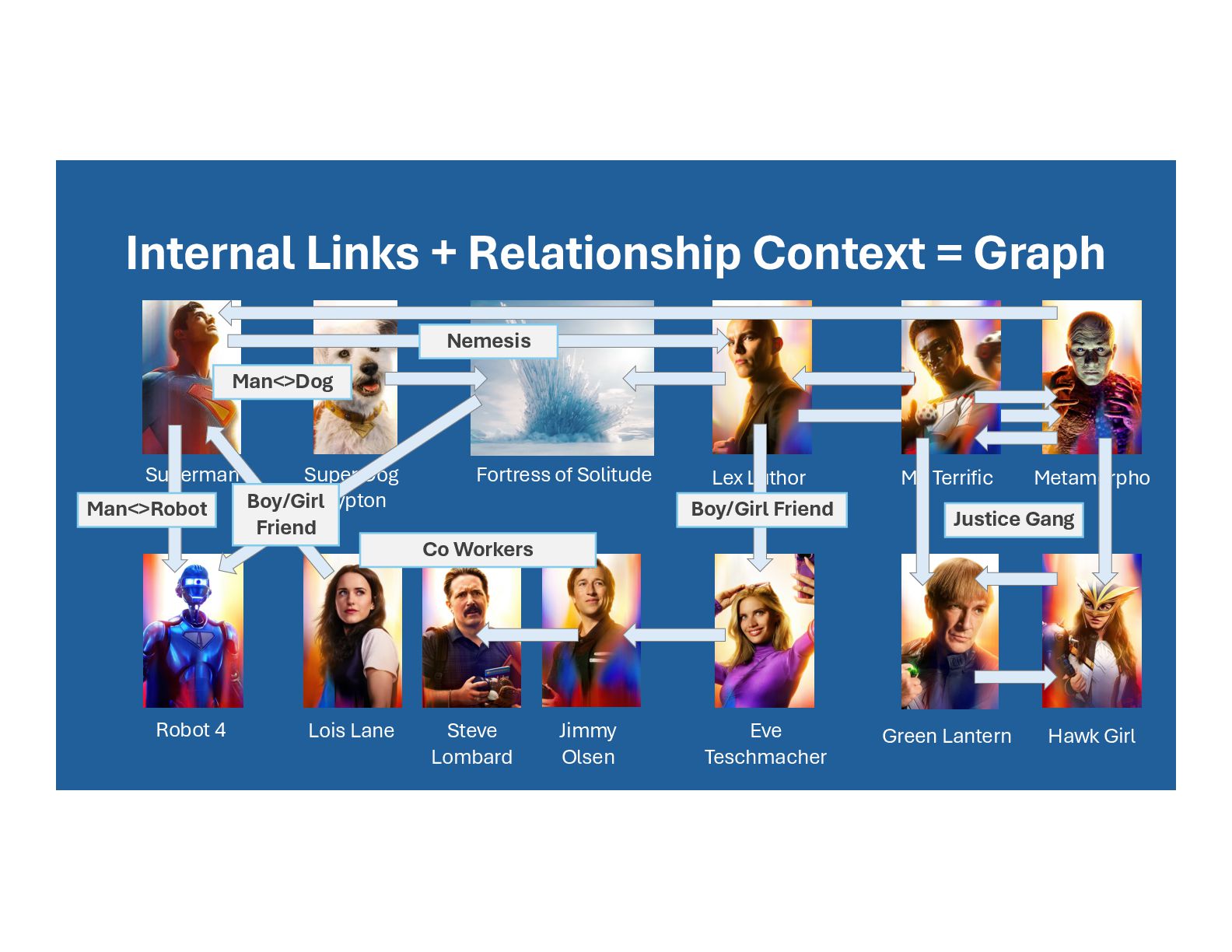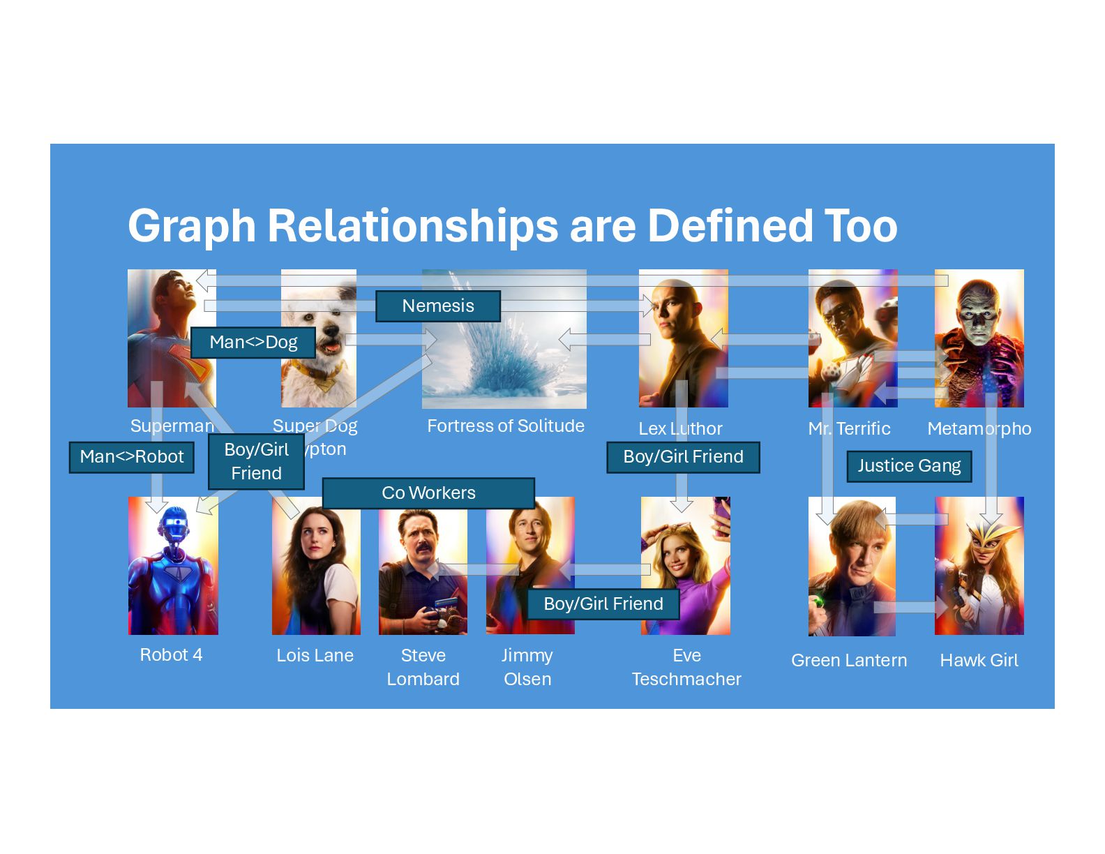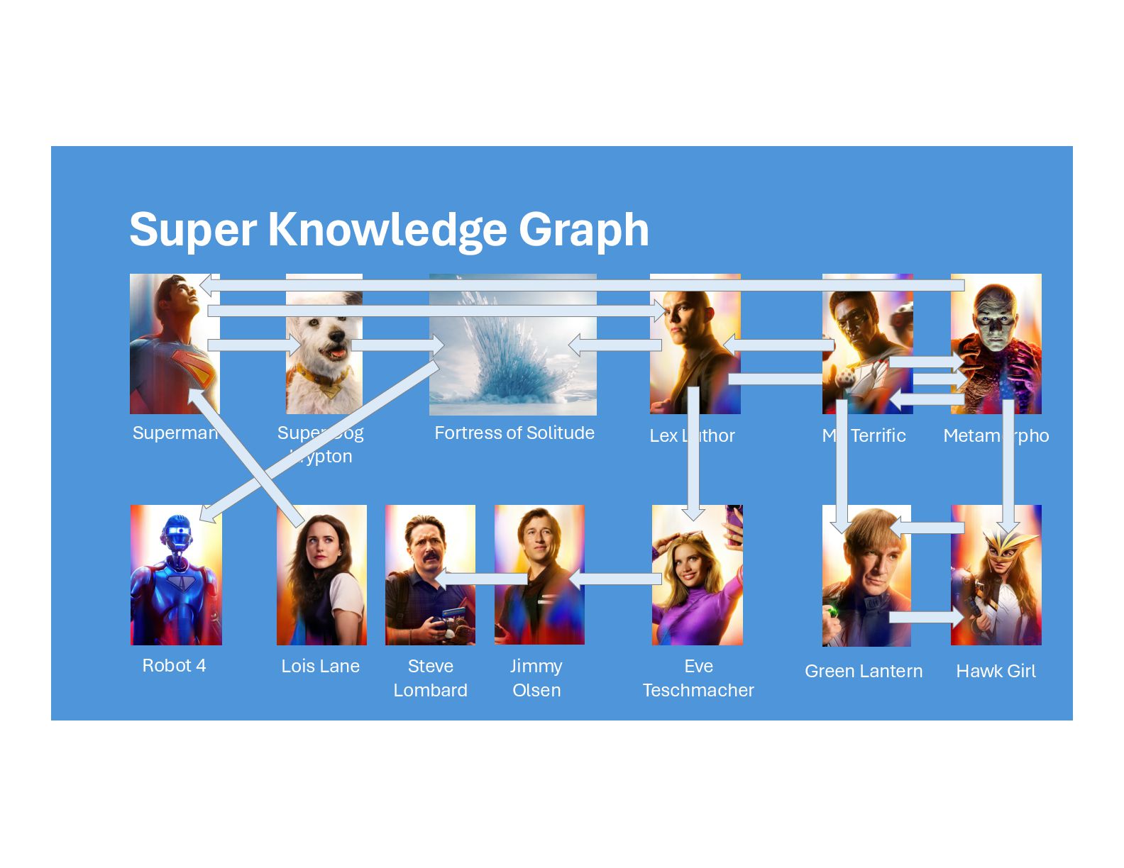Krypton Fortress of Solitude Robot 4 Lex Luthor Eve Teschmacher Jimmy Olsen Lois Lane Steve Lombard Metamorpho Mr. Terrific Green Lantern Hawk Girl Justice Gang Man<>Dog Boy/Girl Friend Co Workers Boy/Girl Friend Man<>Robot Nemesis