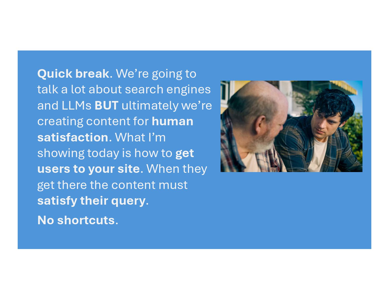 engines and LLMs BUT ultimately we’re creating content for human satisfaction. What I’m showing today is how to get users to your site. When they get there the content must satisfy their query. No shortcuts.