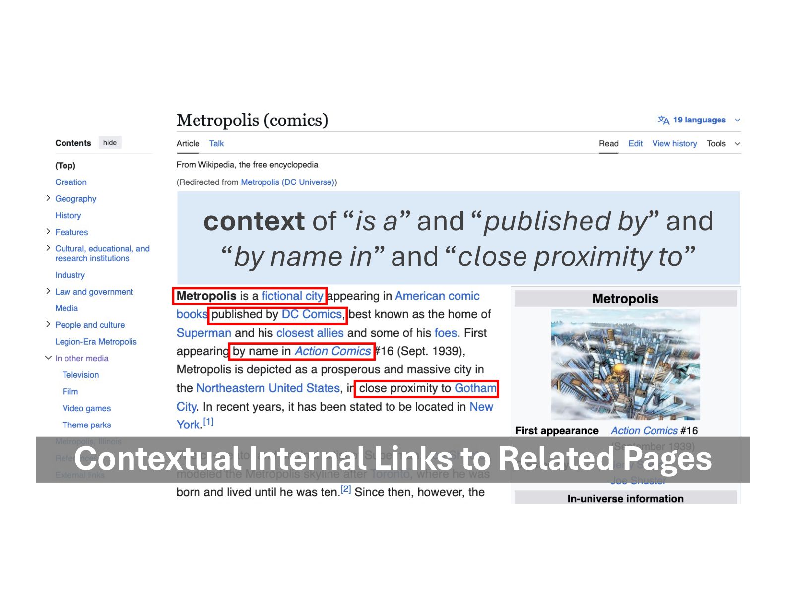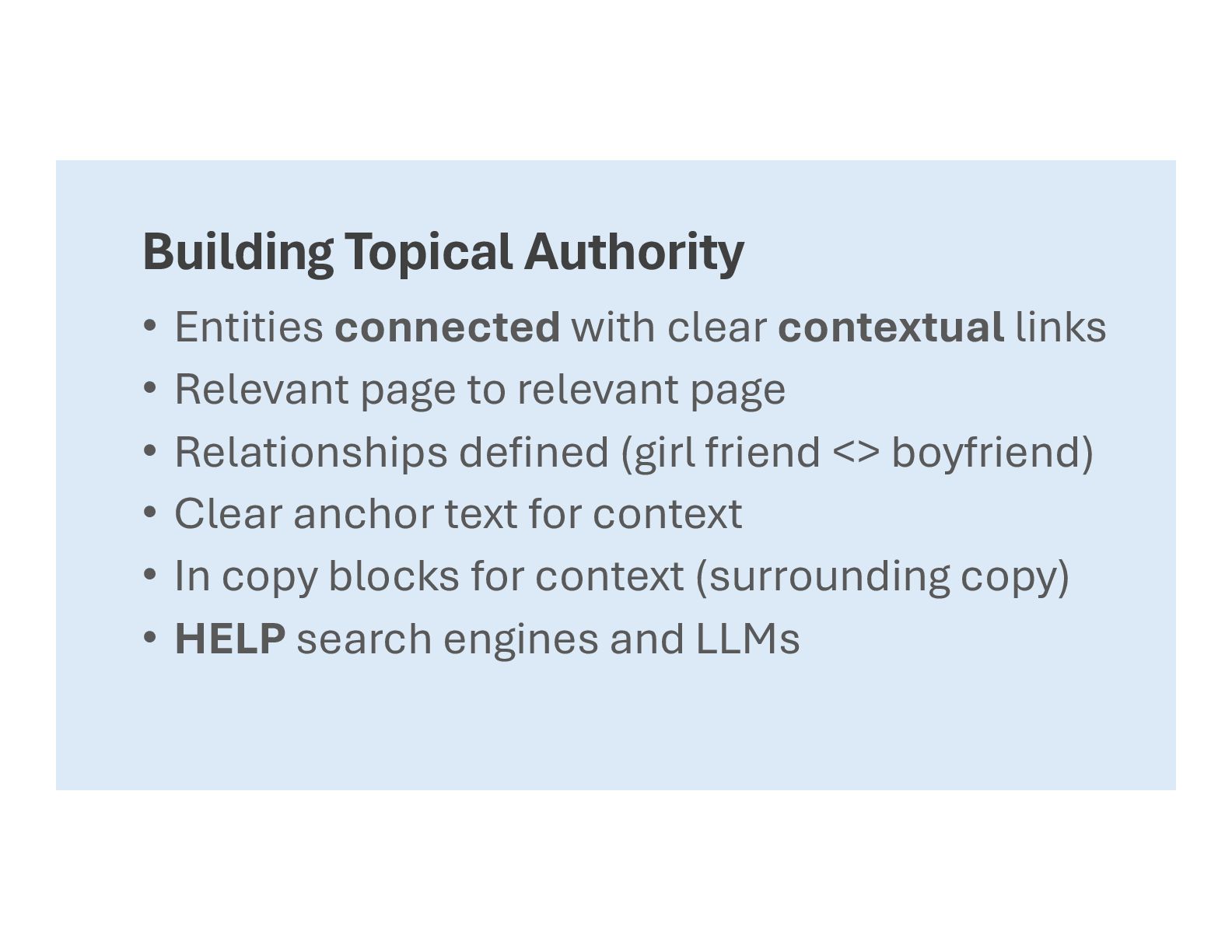 • Relevant page to relevant page • Relationships defined (girl friend <> boyfriend) • Clear anchor text for context • In copy blocks for context (surrounding copy) • HELP search engines and LLMs
