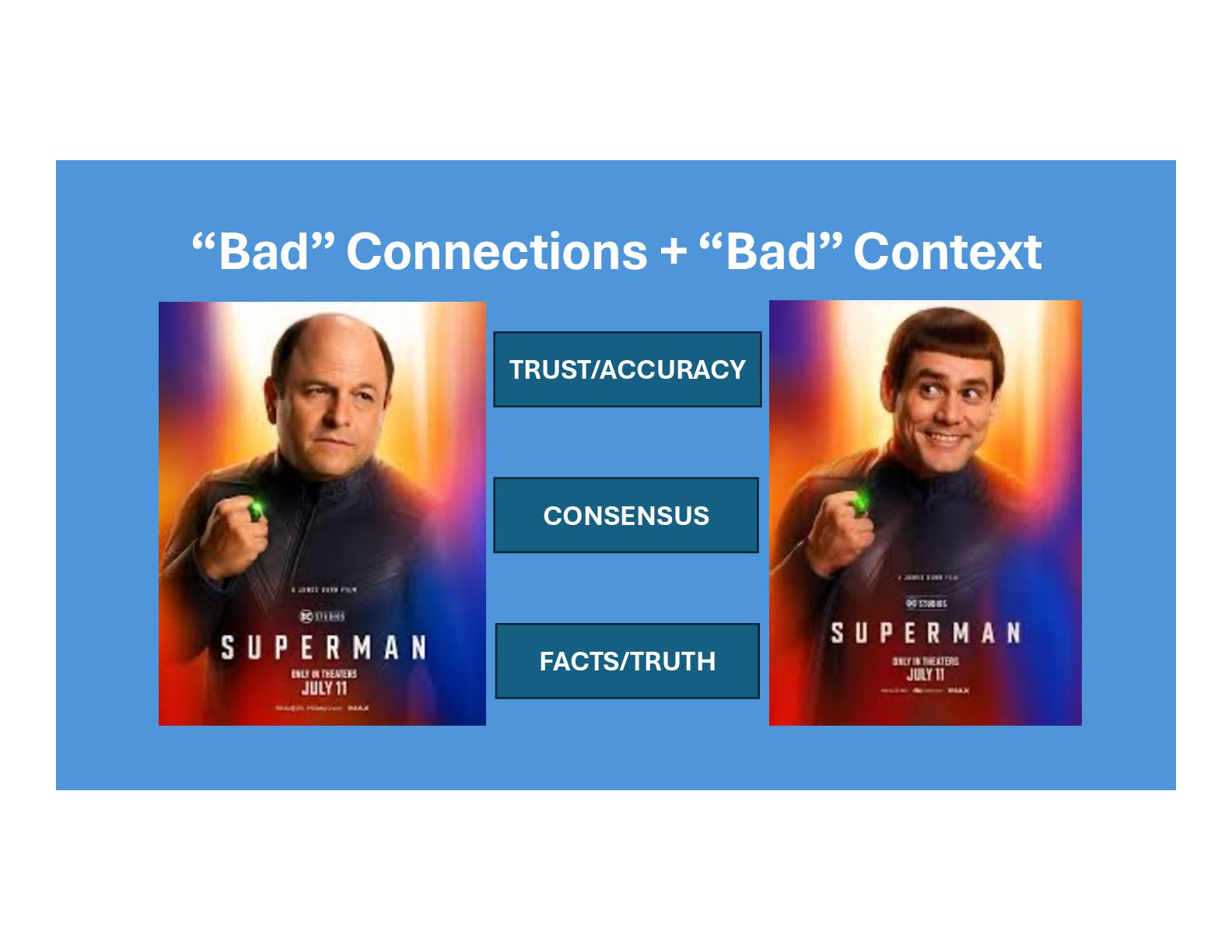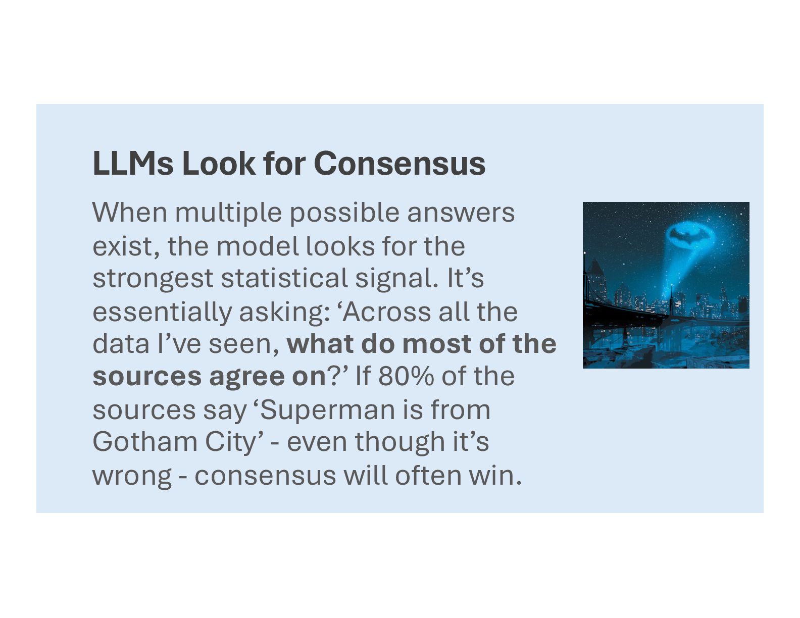 model looks for the strongest statistical signal. It’s essentially asking: ‘Across all the data I’ve seen, what do most of the sources agree on?’ If 80% of the sources say ‘Superman is from Gotham City’ - even though it’s wrong - consensus will often win.