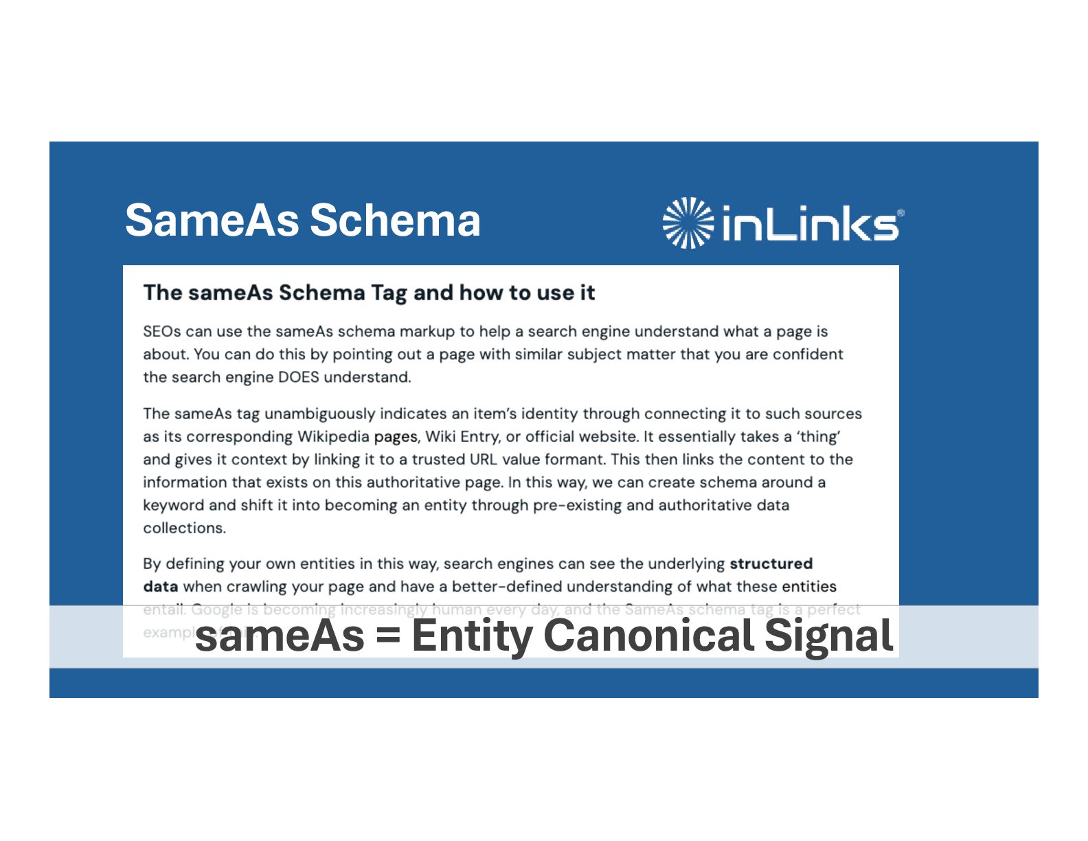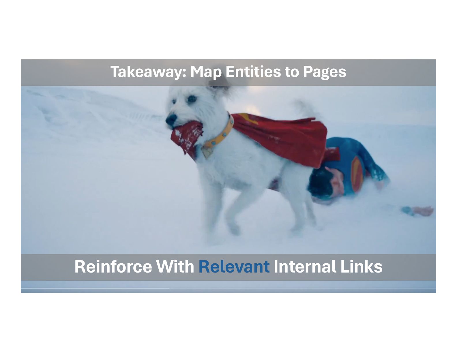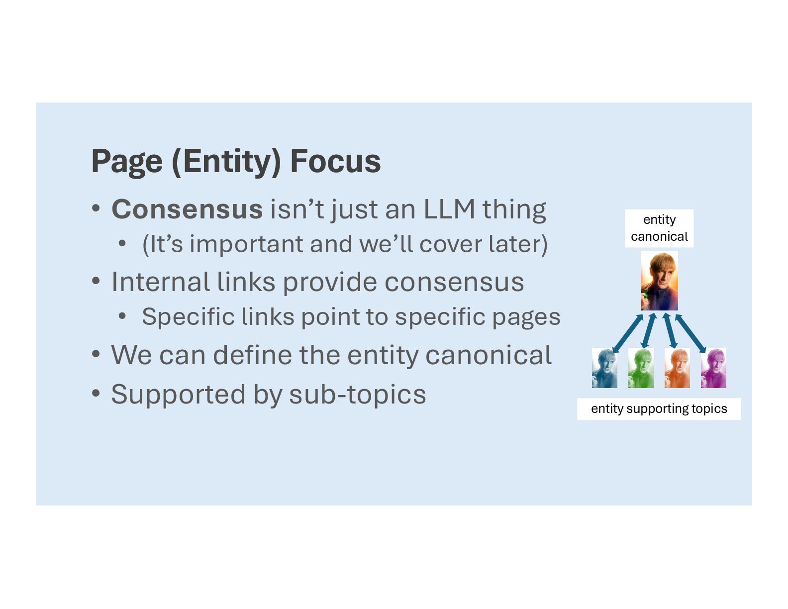 • (It’s important and we’ll cover later) • Internal links provide consensus • Specific links point to specific pages • We can define the entity canonical • Supported by sub-topics entity canonical entity supporting topics