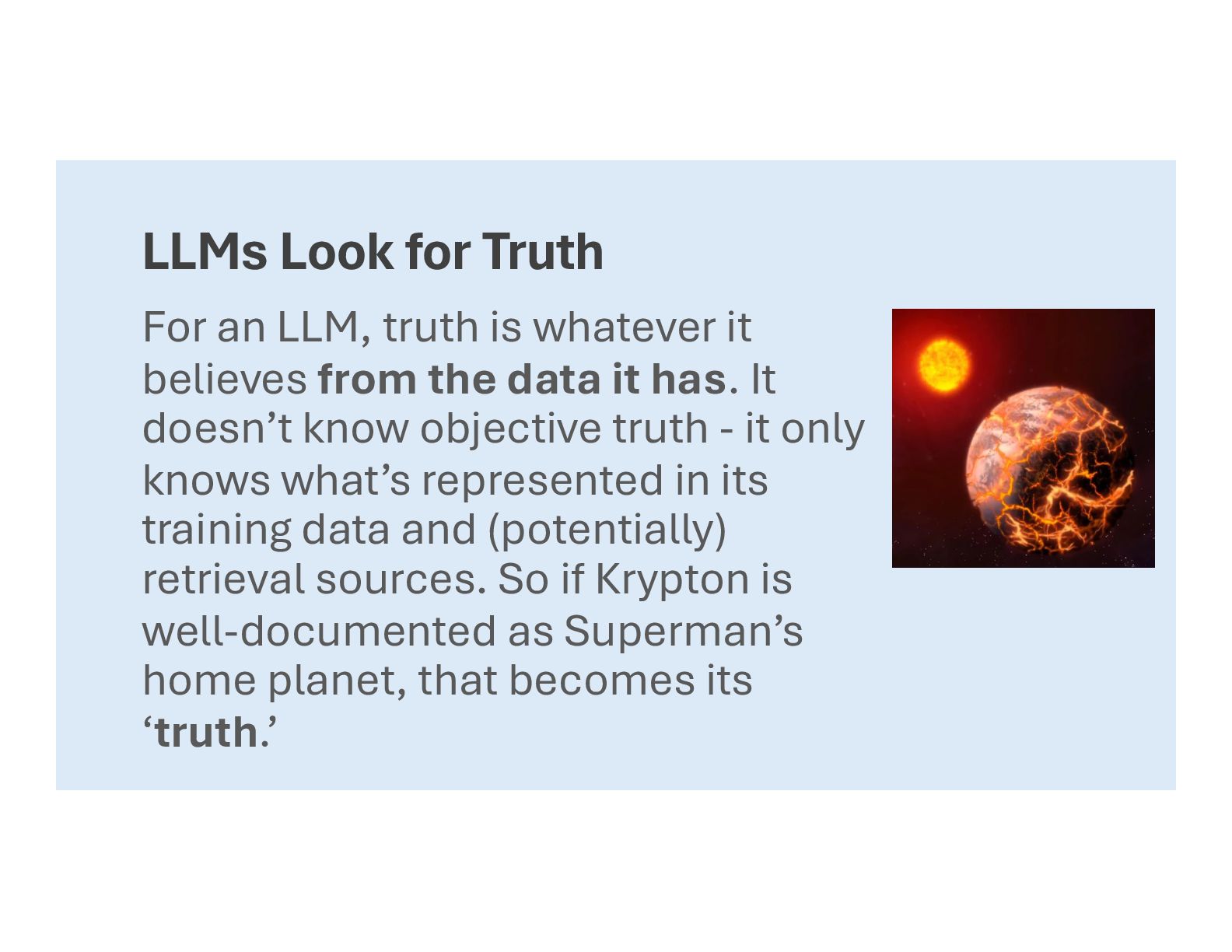 it believes from the data it has. It doesn’t know objective truth - it only knows what’s represented in its training data and (potentially) retrieval sources. So if Krypton is well-documented as Superman’s home planet, that becomes its ‘truth.’