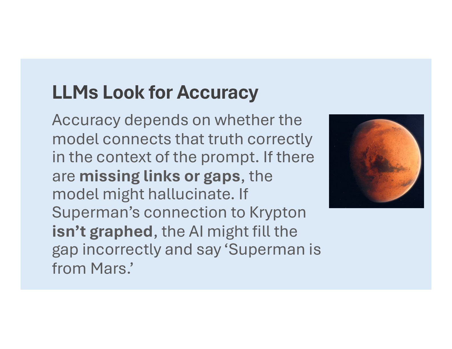 connects that truth correctly in the context of the prompt. If there are missing links or gaps, the model might hallucinate. If Superman’s connection to Krypton isn’t graphed, the AI might fill the gap incorrectly and say ‘Superman is from Mars.’