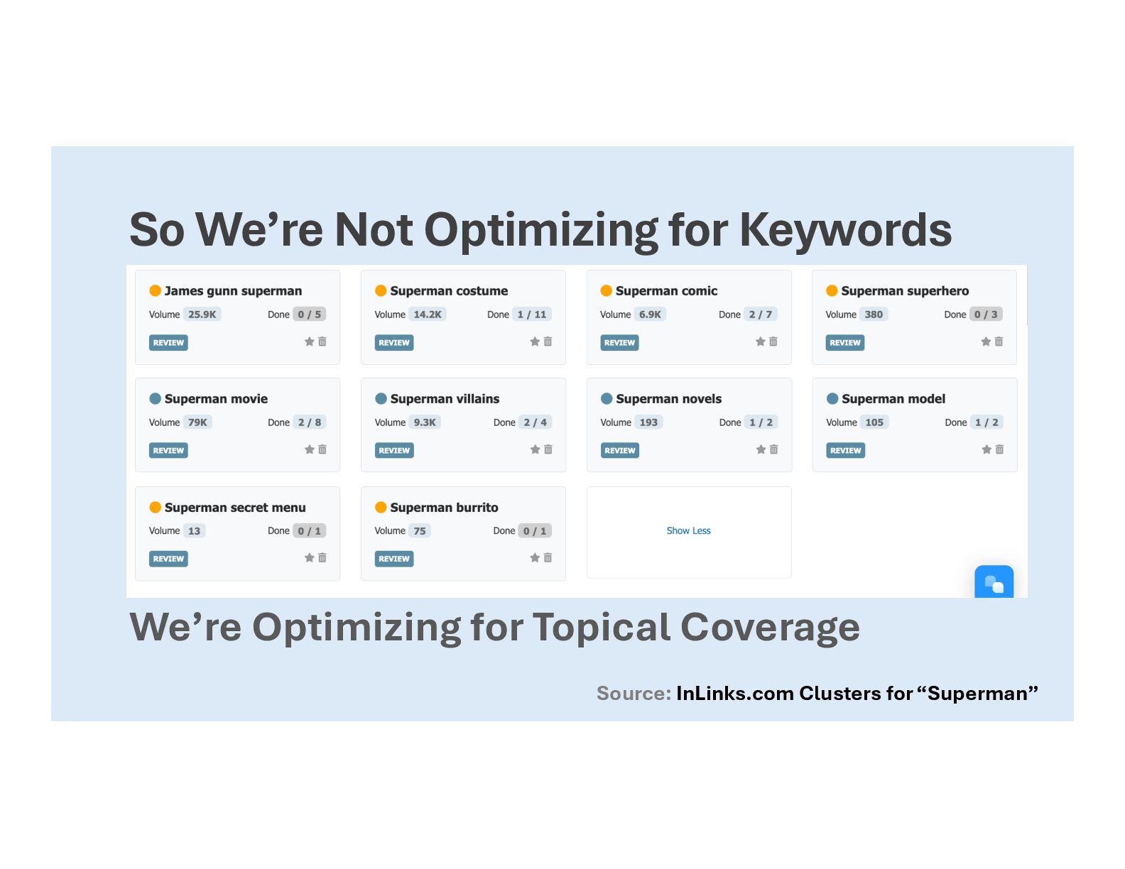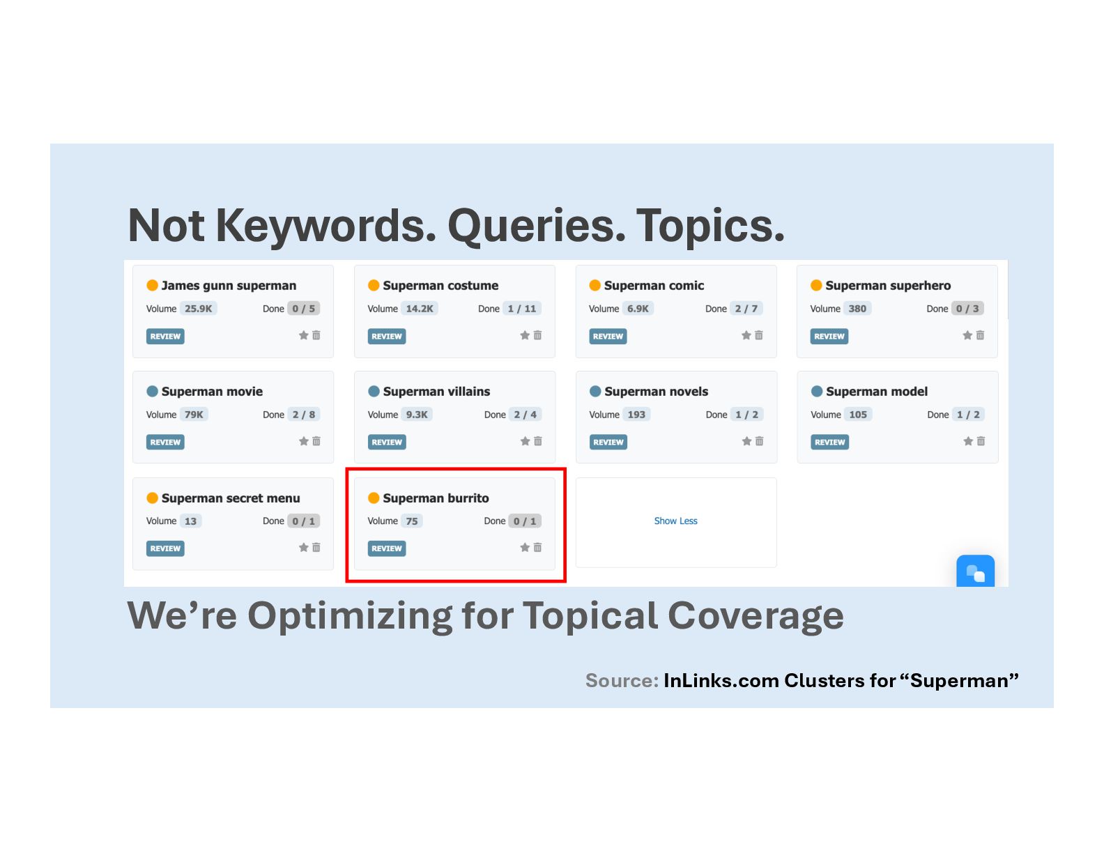 coverage is the process • Smarter research • Looking at every angle • Finding gaps in coverage • Understand audience problems • Satisfy those queries • Answer all questions
