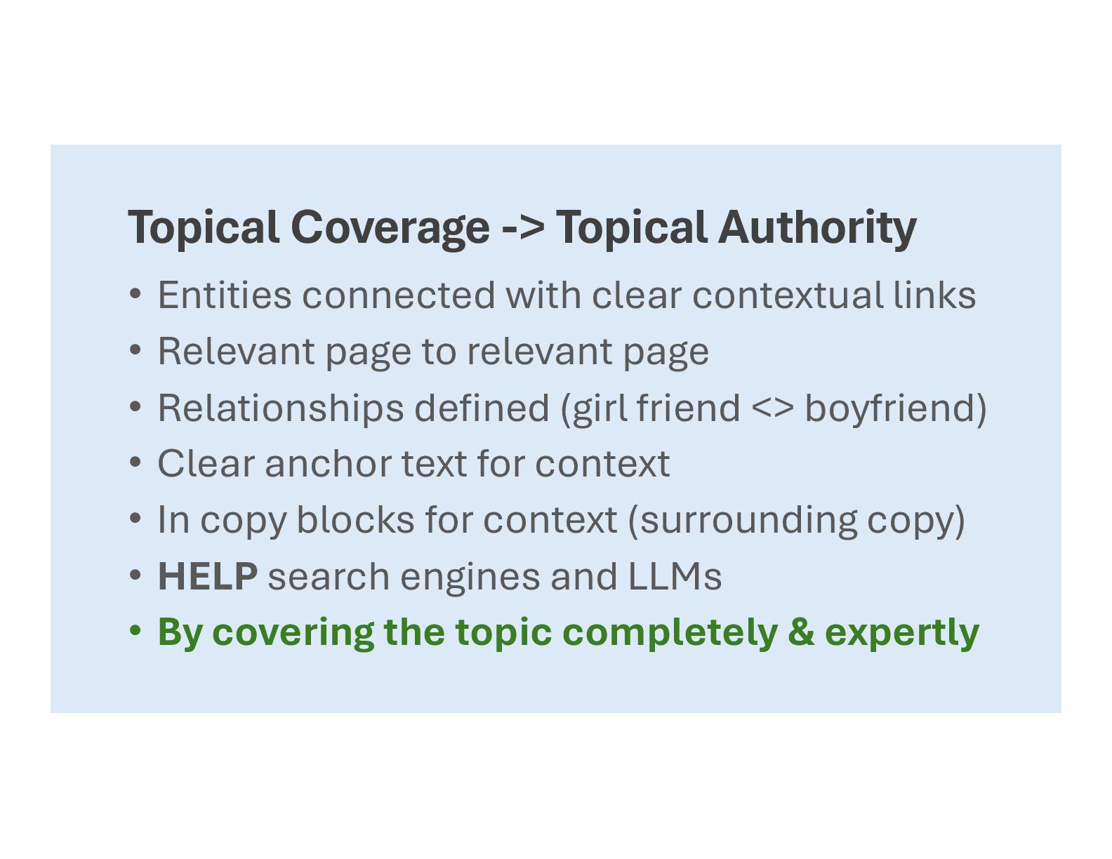 contextual links • Relevant page to relevant page • Relationships defined (girl friend <> boyfriend) • Clear anchor text for context • In copy blocks for context (surrounding copy) • HELP search engines and LLMs • By covering the topic completely & expertly