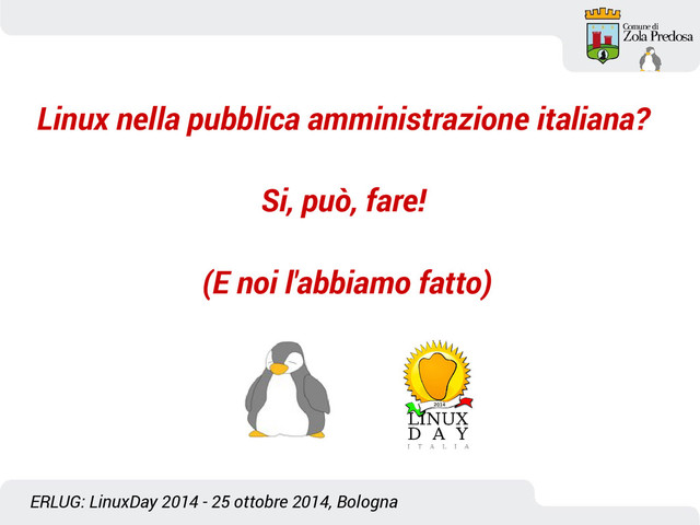 Slide del talk di Simone Dalla, al Linux Day 2014 di Bologna. Si vuole dimostrare, che è possibile portare Linux e il software open source, nella pubblica amministrazione italiana, prendendo ad esempio l'esperienza del Comune di Zola Predosa. Si vuole incoraggiare le varie pubbliche amministrazione a prendere sempre di più in considerazione, l'utilizzo di software open source.
