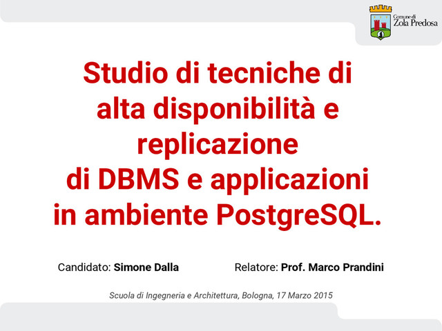 Presentazione illustrata il 17/03/2015 durante la discussione della tesi di laurea "Studio di tecniche di alta disponibilità e replicazione di DBMS e applicazioni in ambiente PostgreSQL."