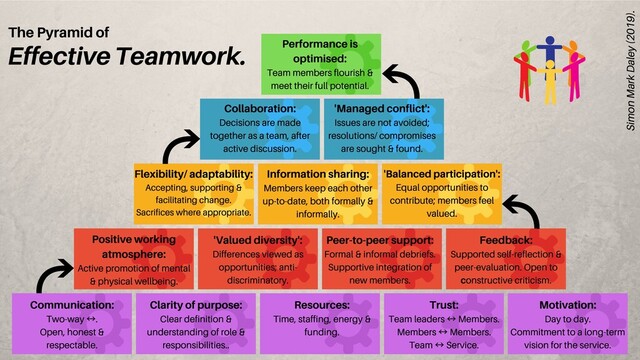 their full potential. Collaboration: Decisions are made together as a team, after active discussion. 'Managed conflict': Issues are not avoided; resolutions/ compromises are sought & found. Flexibility/ adaptability: Accepting, supporting & facilitating change. Sacrifices where appropriate. Information sharing: Members keep each other up-to-date, both formally & informally. 'Balanced participation': Equal opportunities to contribute; members feel valued. Positive working atmosphere: Active promotion of mental & physical wellbeing. 'Valued diversity': Differences viewed as opportunities; anti- discriminatory. Peer-to-peer support: Formal & informal debriefs. Supportive integration of new members. Feedback: Supported self-reflection & peer-evaluation. Open to constructive criticism. Communication: Two-way ↔. Open, honest & respectable. Clarity of purpose: Clear definition & understanding of role & responsibilities.. Resources: Time, staffing, energy & funding. Trust: Team leaders ↔ Members. Members ↔ Members. Team ↔ Service. Motivation: Day to day. Commitment to a long-term vision for the service. Simon Mark Daley (2019). The Pyramid of