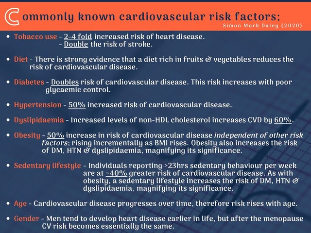 D a l e y ( 2 0 2 0 ) ommonly known cardiovascular risk factors; Tobacco use - 2-4 fold increased risk of heart disease. Diet - There is strong evidence that a diet rich in fruits & vegetables reduces the Diabetes - Doubles risk of cardiovascular disease. This risk increases with poor Hypertension - 50% increased risk of cardiovascular disease. Dyslipidaemia - Increased levels of non-HDL cholesterol increases CVD by 60%. Obesity - 50% increase in risk of cardiovascular disease independent of other risk Sedentary lifestyle - Individuals reporting >23hrs sedentary behaviour per week Age - Cardiovascular disease progresses over time, therefore risk rises with age. Gender - Men tend to develop heart disease earlier in life, but after the menopause - Double the risk of stroke. risk of cardiovascular disease. glycaemic control. factors; rising incrementally as BMI rises. Obesity also increases the risk of DM, HTN & dyslipidaemia, magnifying its significance. are at ~40% greater risk of cardiovascular disease. As with obesity, a sedentary lifestyle increases the risk of DM, HTN & dyslipidaemia, magnifying its significance. CV risk becomes essentially the same.