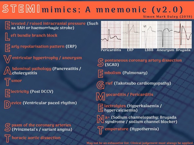 levated / raised intracranial pressure (Such as SAH or haemorrhagic stroke) S E G M E N T eft bundle branch block entricular hypertrophy / aneurysm pontaneous coronary artery dissection (SCAD) umor evice (Ventricular paced rhythm) emperature (Hypothermia) pasm of the coronary arteries (Prinzmetal's / variant angina) mbolism (Pulmonary) rief (Takotsubo cardiomyopathy) yocarditis / Pericarditis lectrolytes (Hyperkalaemia / hypercalcaemia) a+ (Sodium channelopathy; Brugada syndrome / sodium channel blocker) horacic aortic dissection S T E M I S i m o n M a r k D a l e y ( 2 0 1 9 ) m i m i c s ; A m n e m o n i c ( v 2 . 0 ) arly repolarisation pattern (ERP) bdominal pathology (Pancreatitis / cholecystitis lectricity (Post DCCV) Pericarditis ERP LBBB Aneurysm Brugada May not be an exhaustive list; Clinical judgement must always be applied.