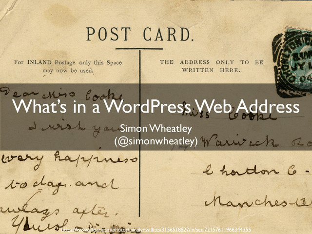 Here's the code I use throughout the presentation, as a plugin to download and slice and dice: https://github.com/simonwheatley/wcldn-web-addresses
