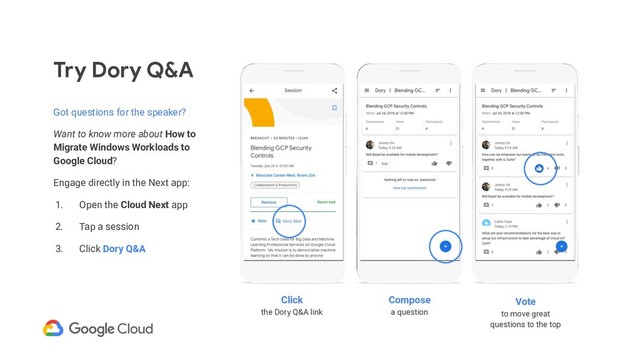 Workloads to Google Cloud? Engage directly in the Next app: 1. Open the Cloud Next app 2. Tap a session 3. Click Dory Q&A Compose a question Vote to move great questions to the top Click the Dory Q&A link