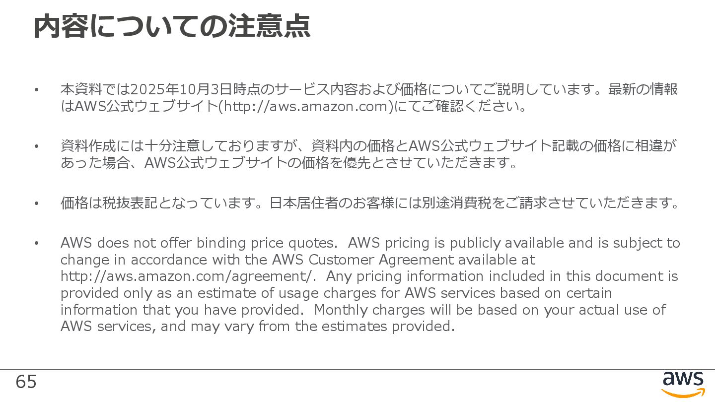 • AWS does not offer binding price quotes. AWS pricing is publicly available and is subject to change in accordance with the AWS Customer Agreement available at http://aws.amazon.com/agreement/. Any pricing information included in this document is provided only as an estimate of usage charges for AWS services based on certain information that you have provided. Monthly charges will be based on your actual use of AWS services, and may vary from the estimates provided.
