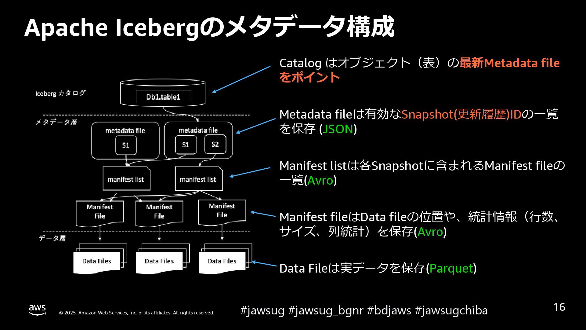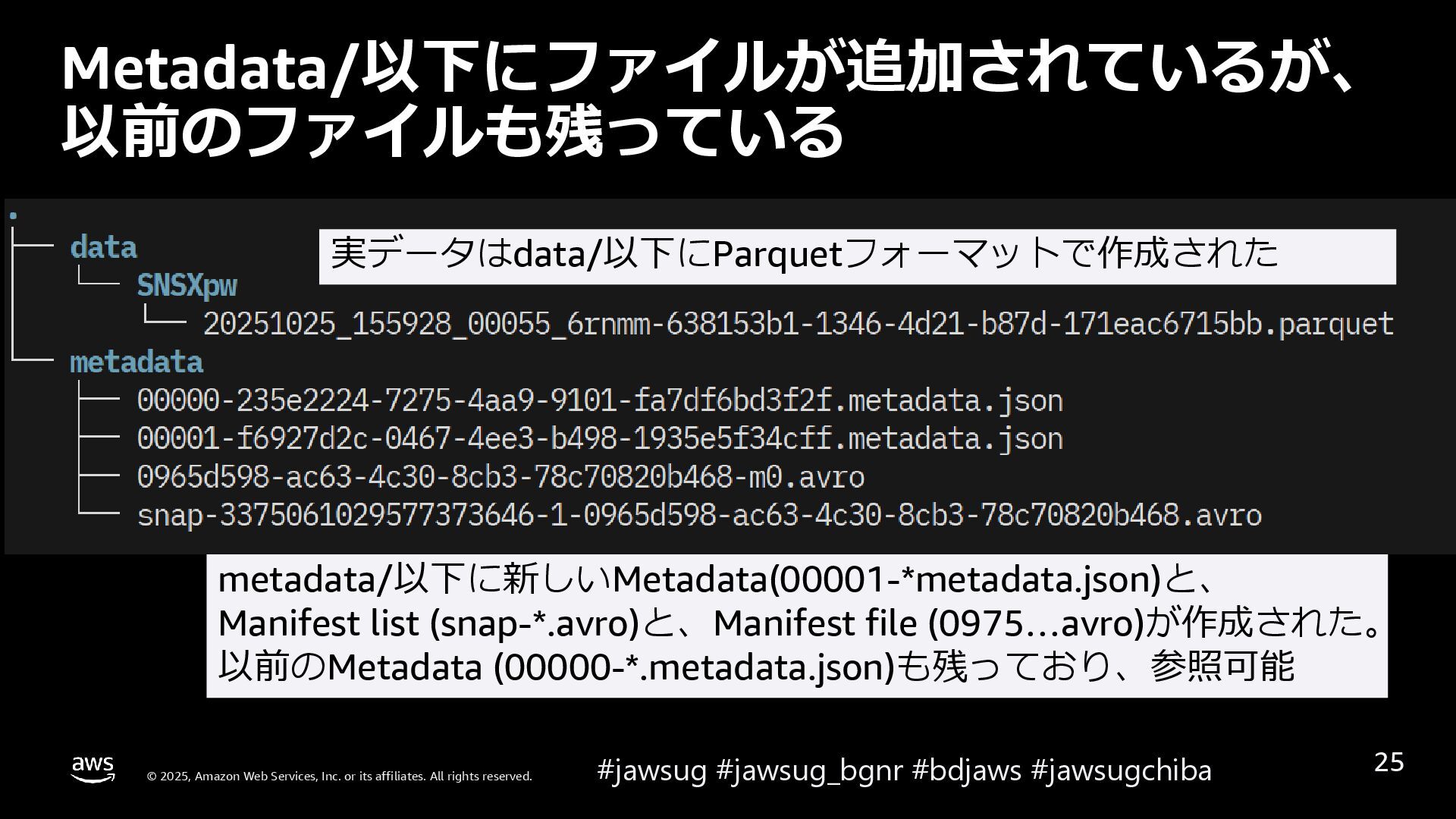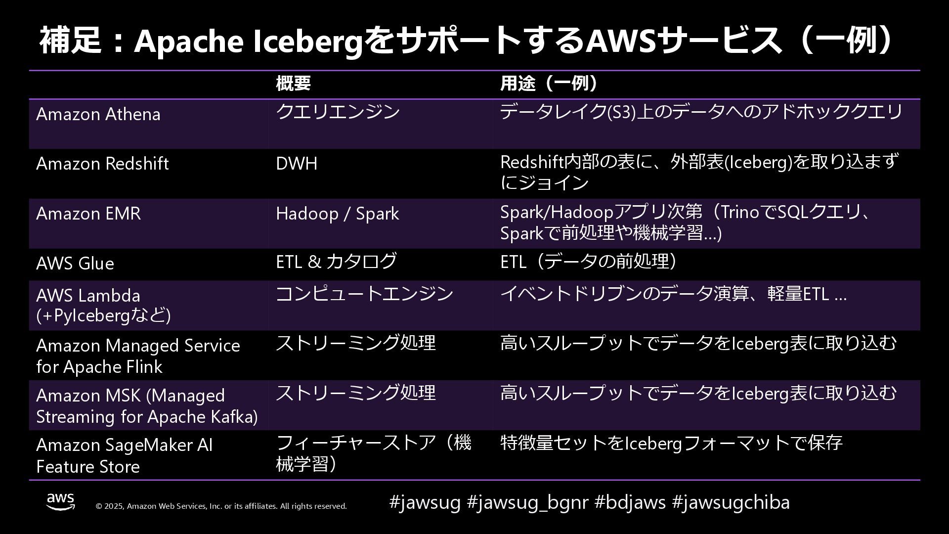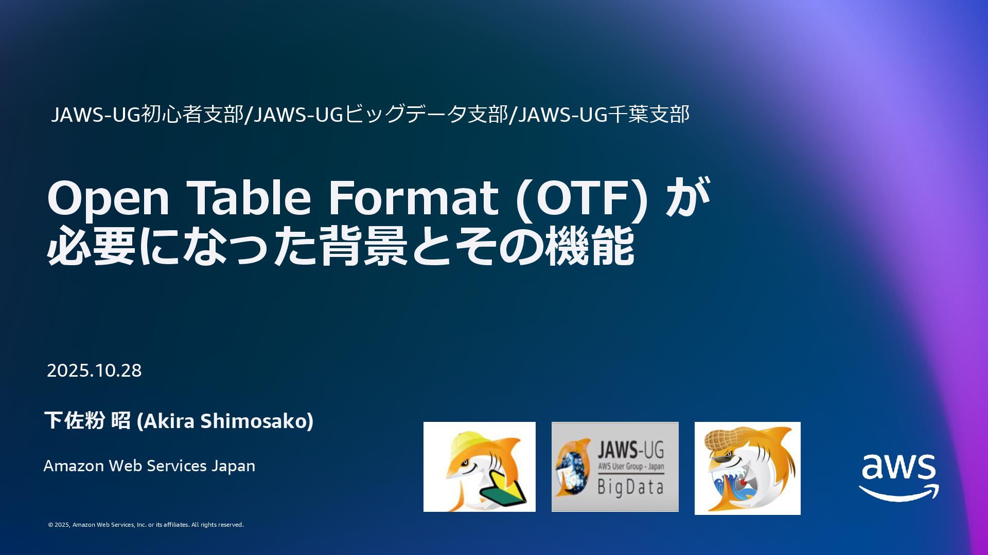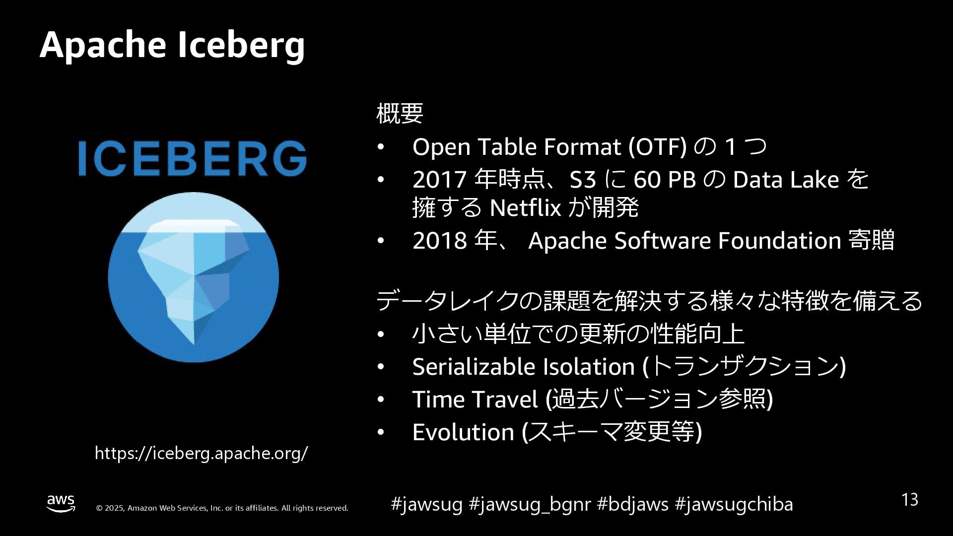 2025年10月28日開催、JAWS-UG初心者支部 / BigData支部 / 千葉支部 合同の「Apache Iceberg勉強会」での発表資料です。