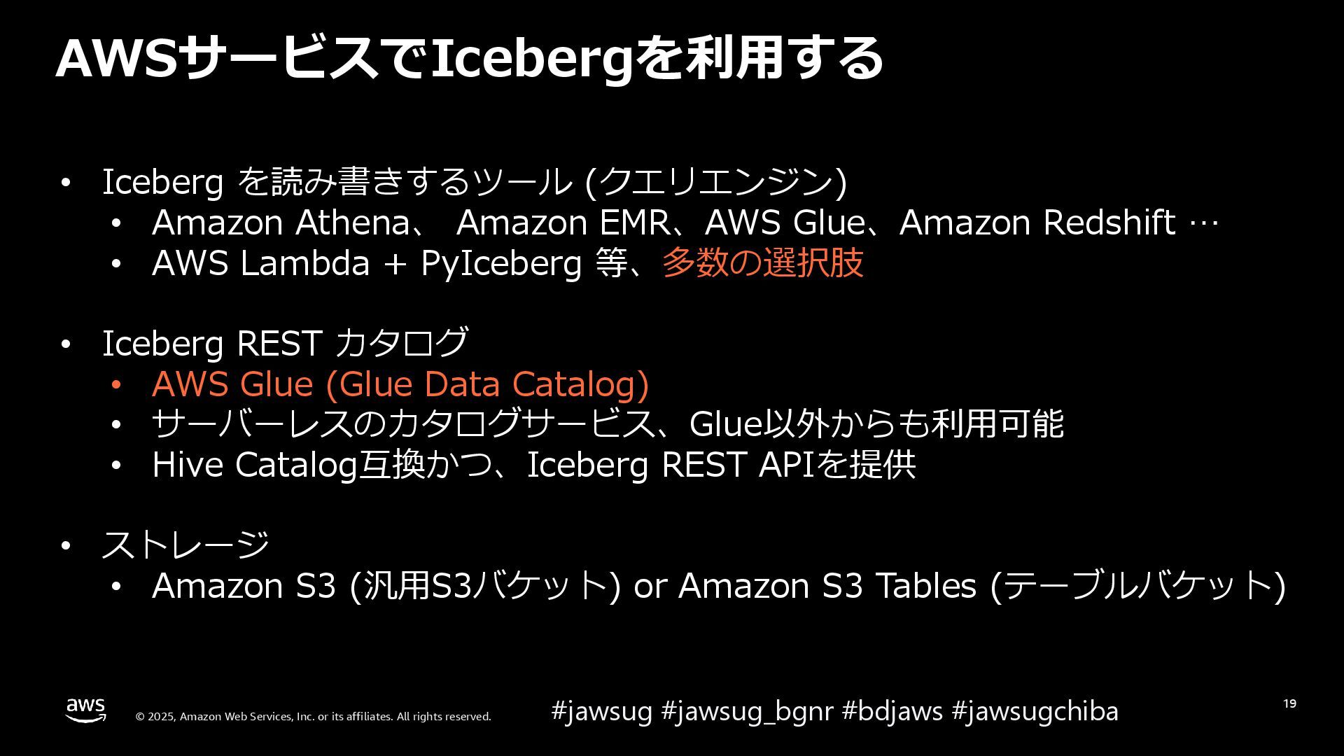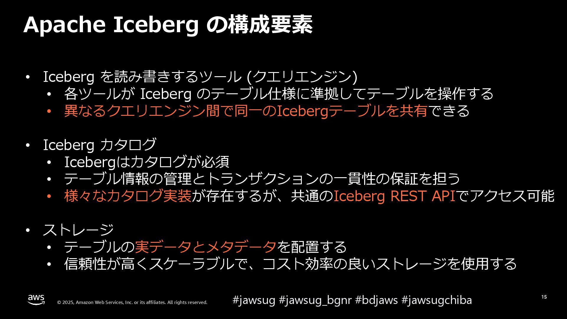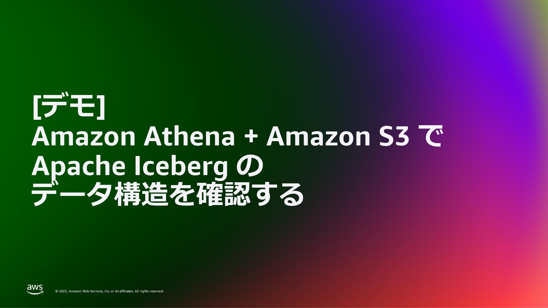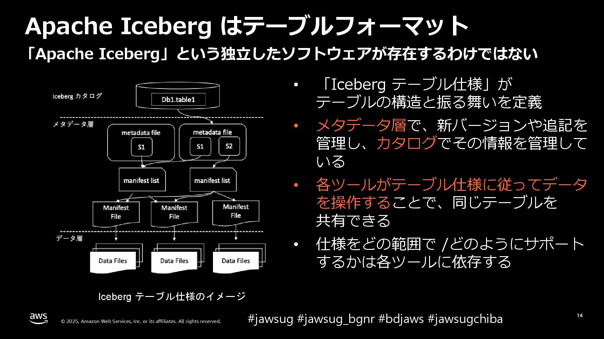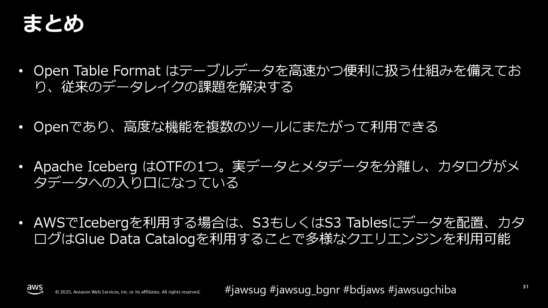 2025年10月28日開催、JAWS-UG初心者支部 / BigData支部 / 千葉支部 合同の「Apache Iceberg勉強会」での発表資料です。