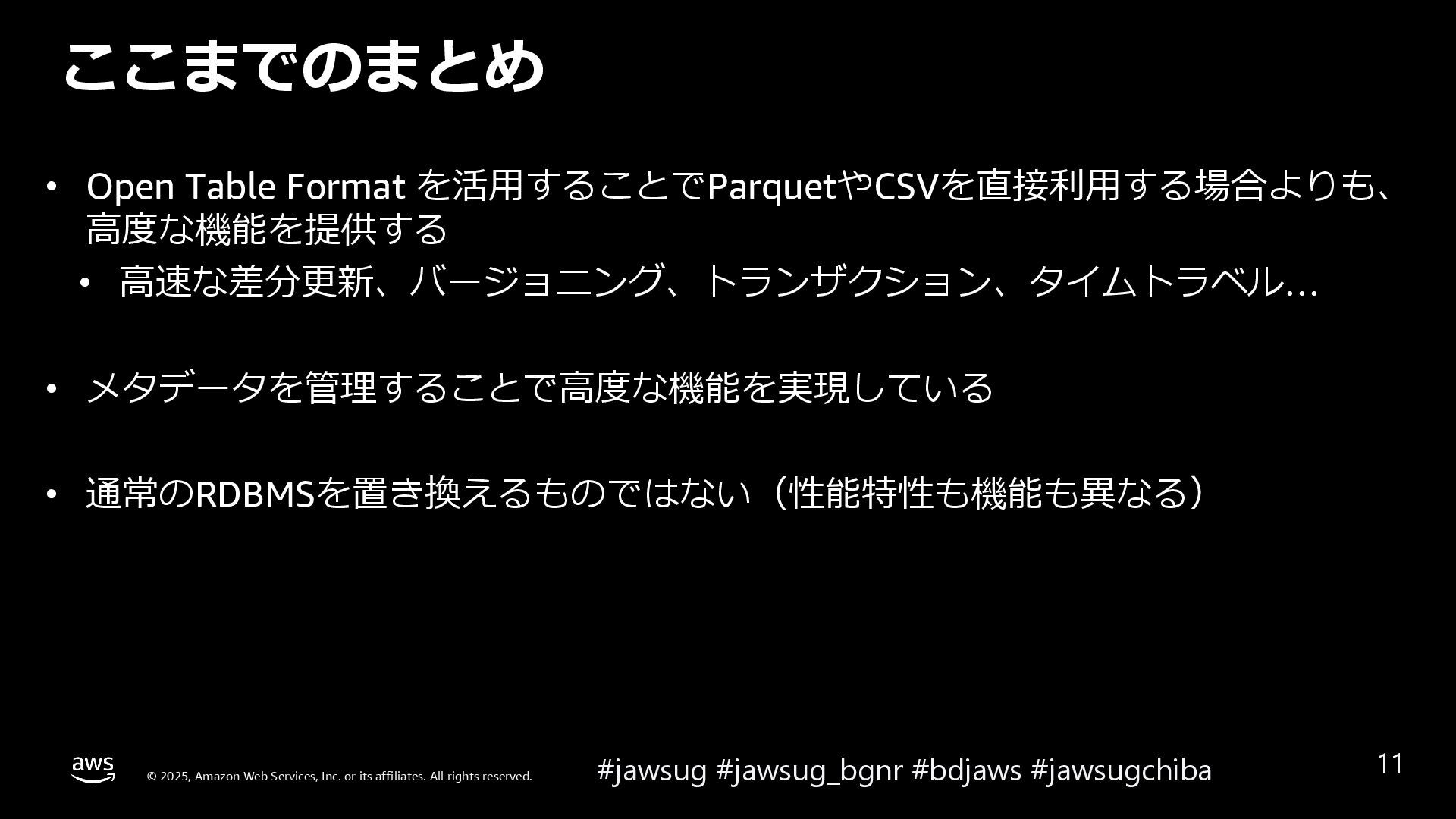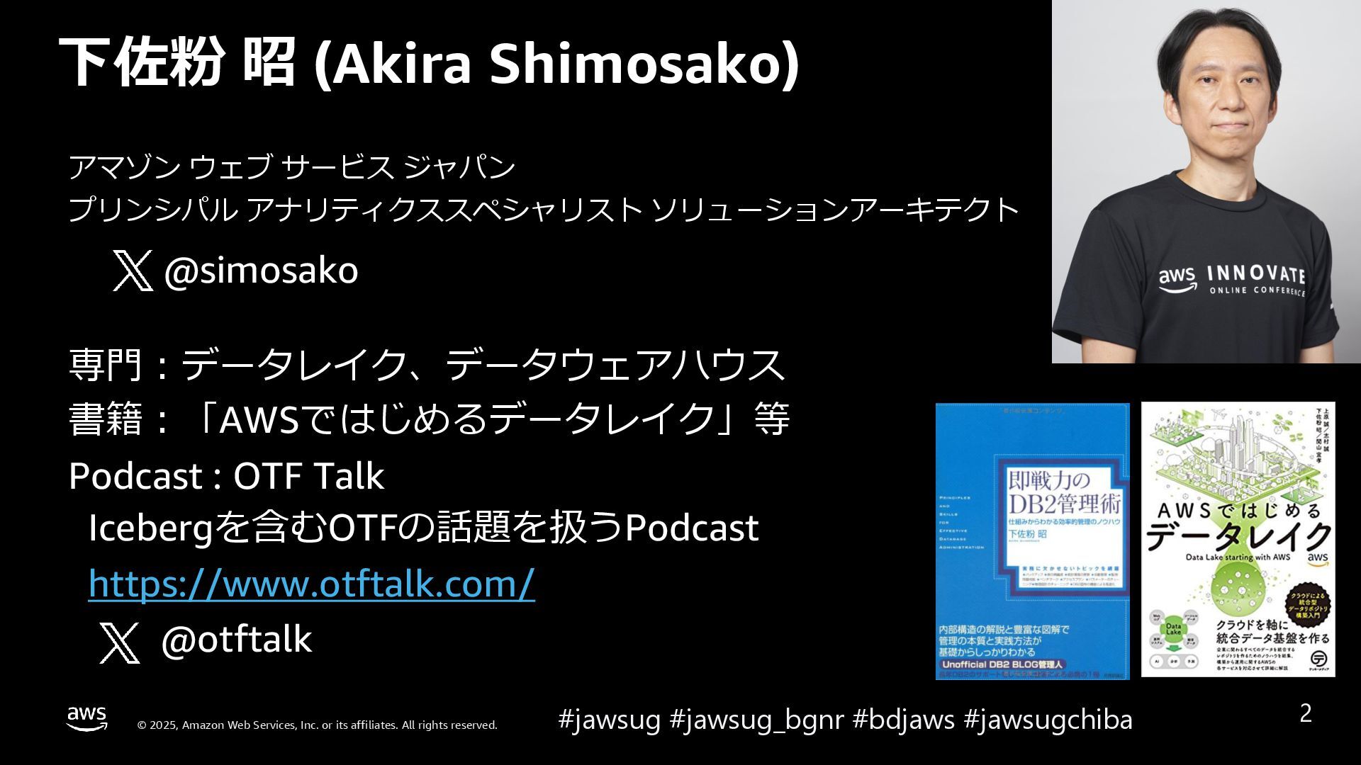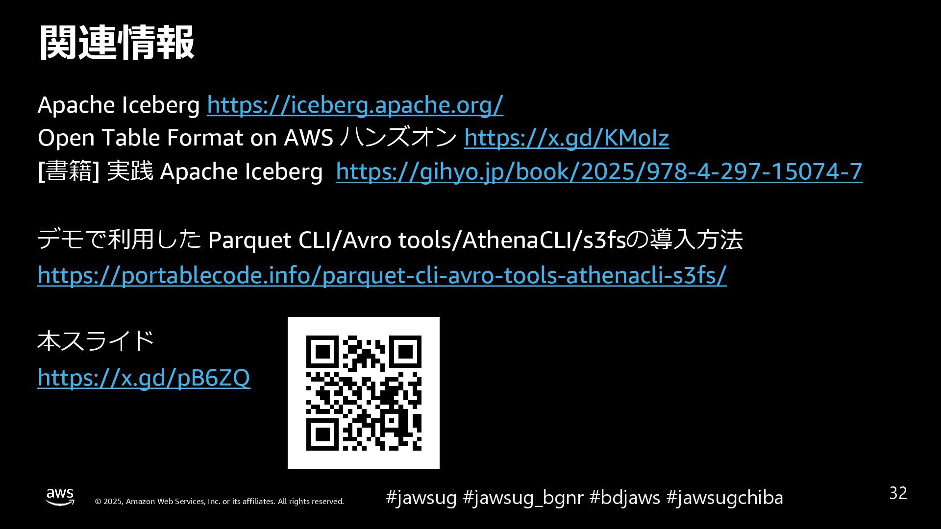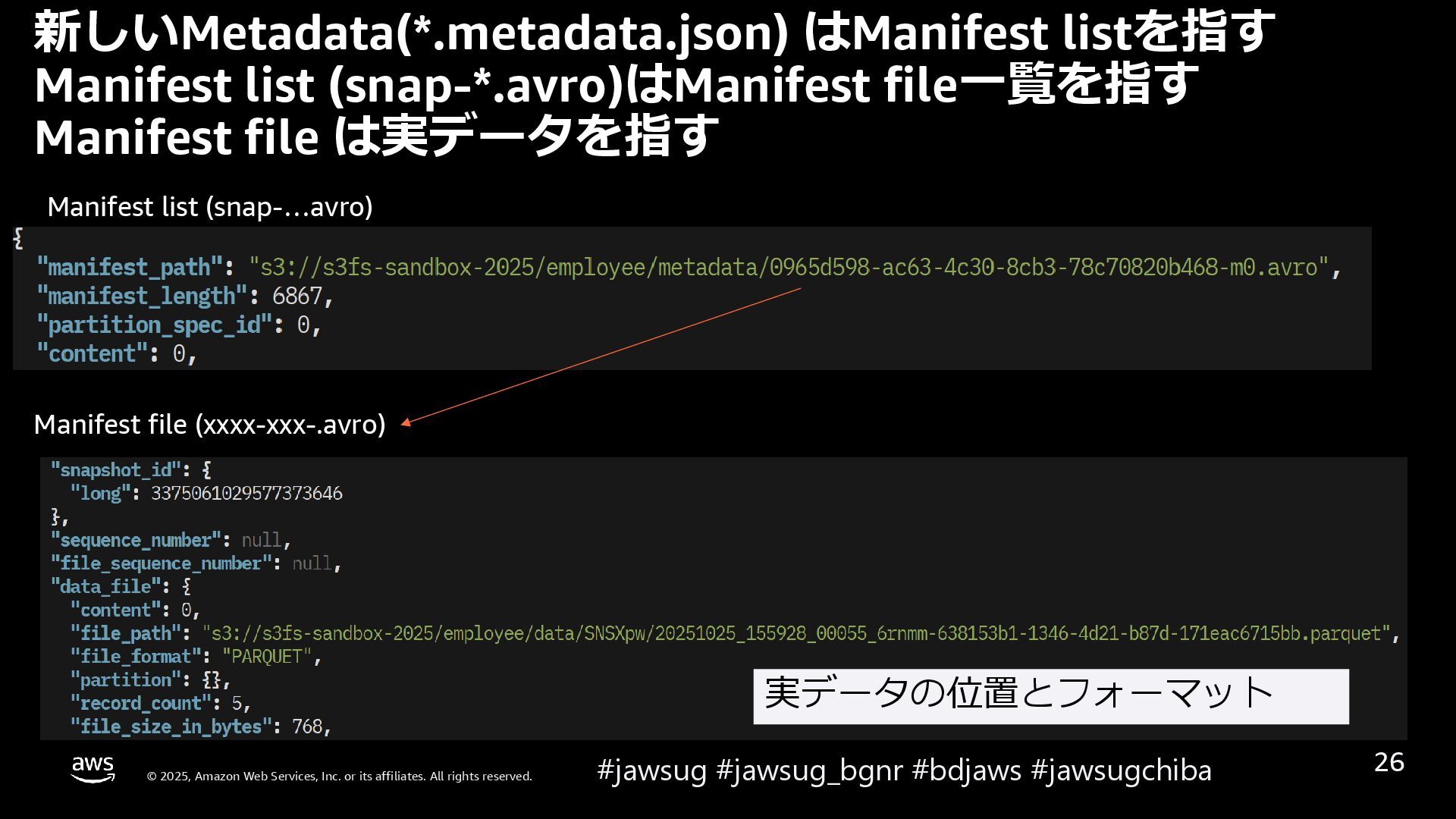 2025年10月28日開催、JAWS-UG初心者支部 / BigData支部 / 千葉支部 合同の「Apache Iceberg勉強会」での発表資料です。