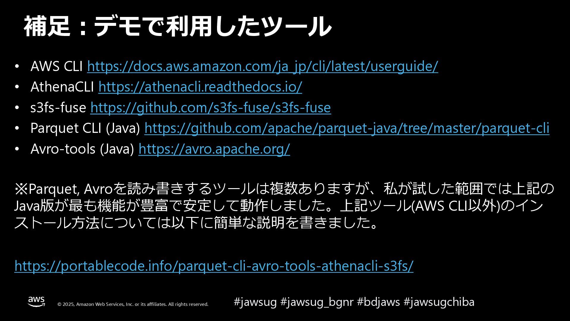 ※デモで利用した Parquet CLIや、Avro-tools、AthenaCLI、s3fsの導入方法は以下に記載しています。