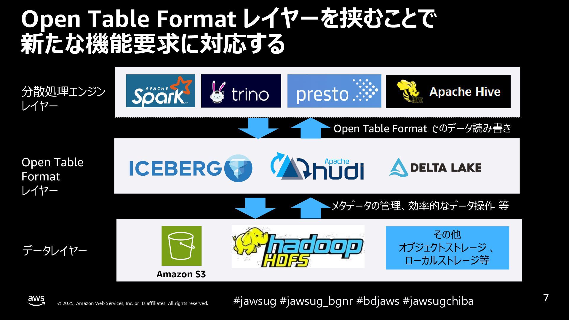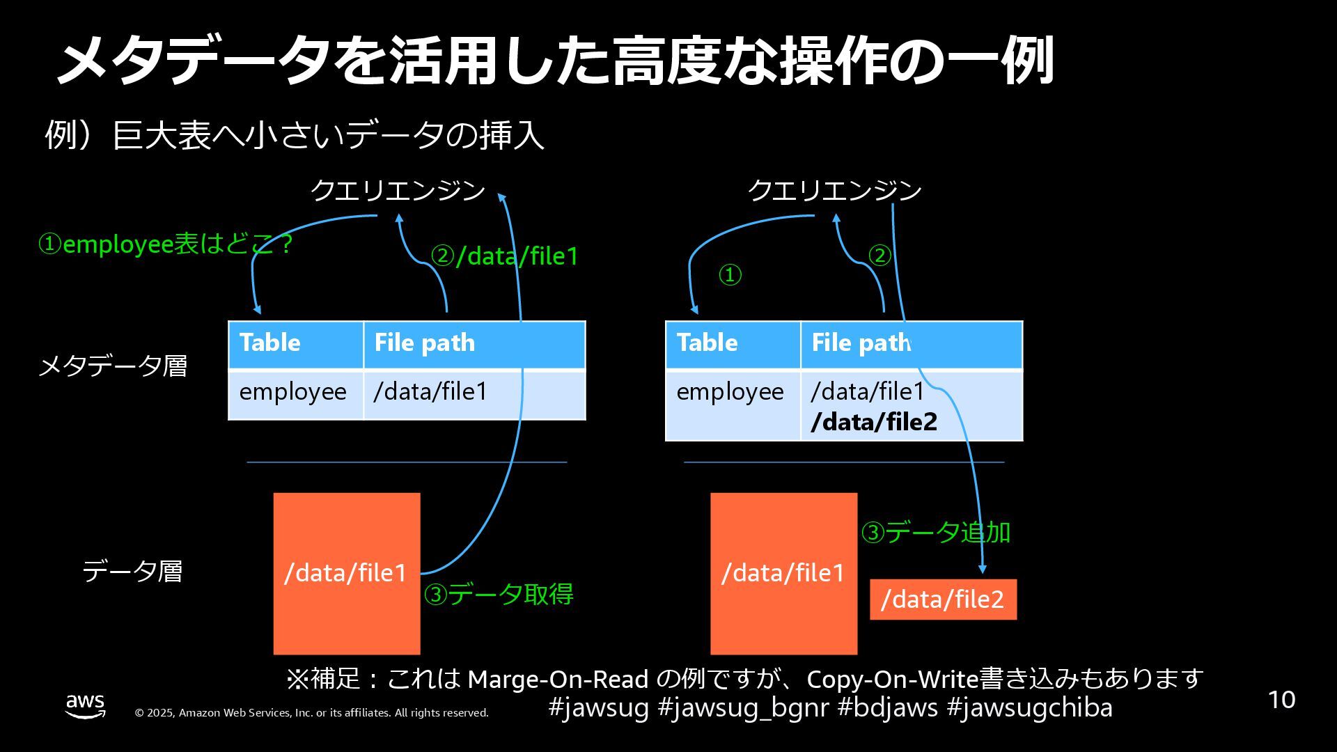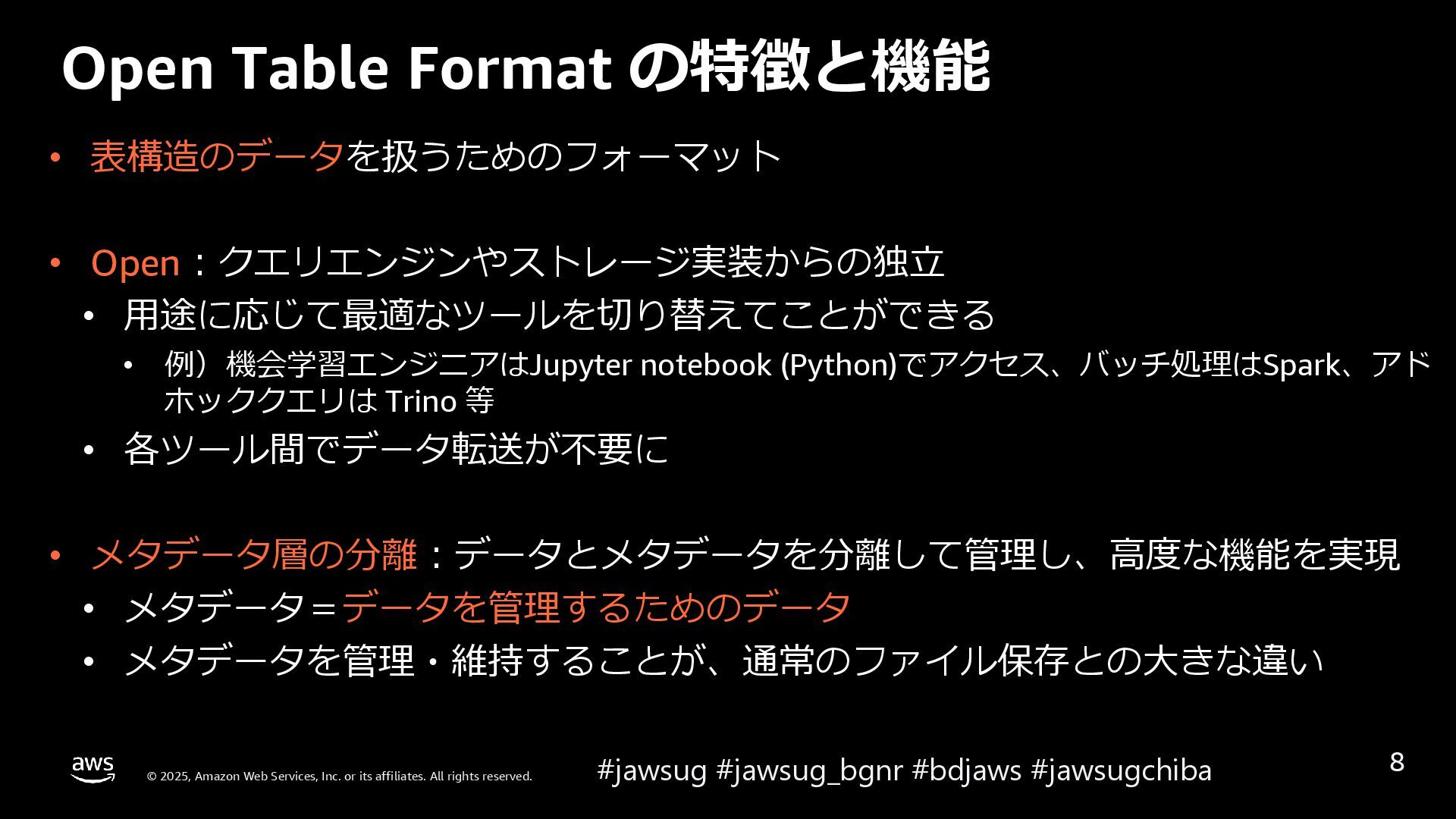 なぜ Apache Iceberg のような Open Table Format が必要になったかを説明した後、 Apache Icebergを例に、表を操作すると内部データはどのように変化し、高度な機能を実現しているのかを解説しています。