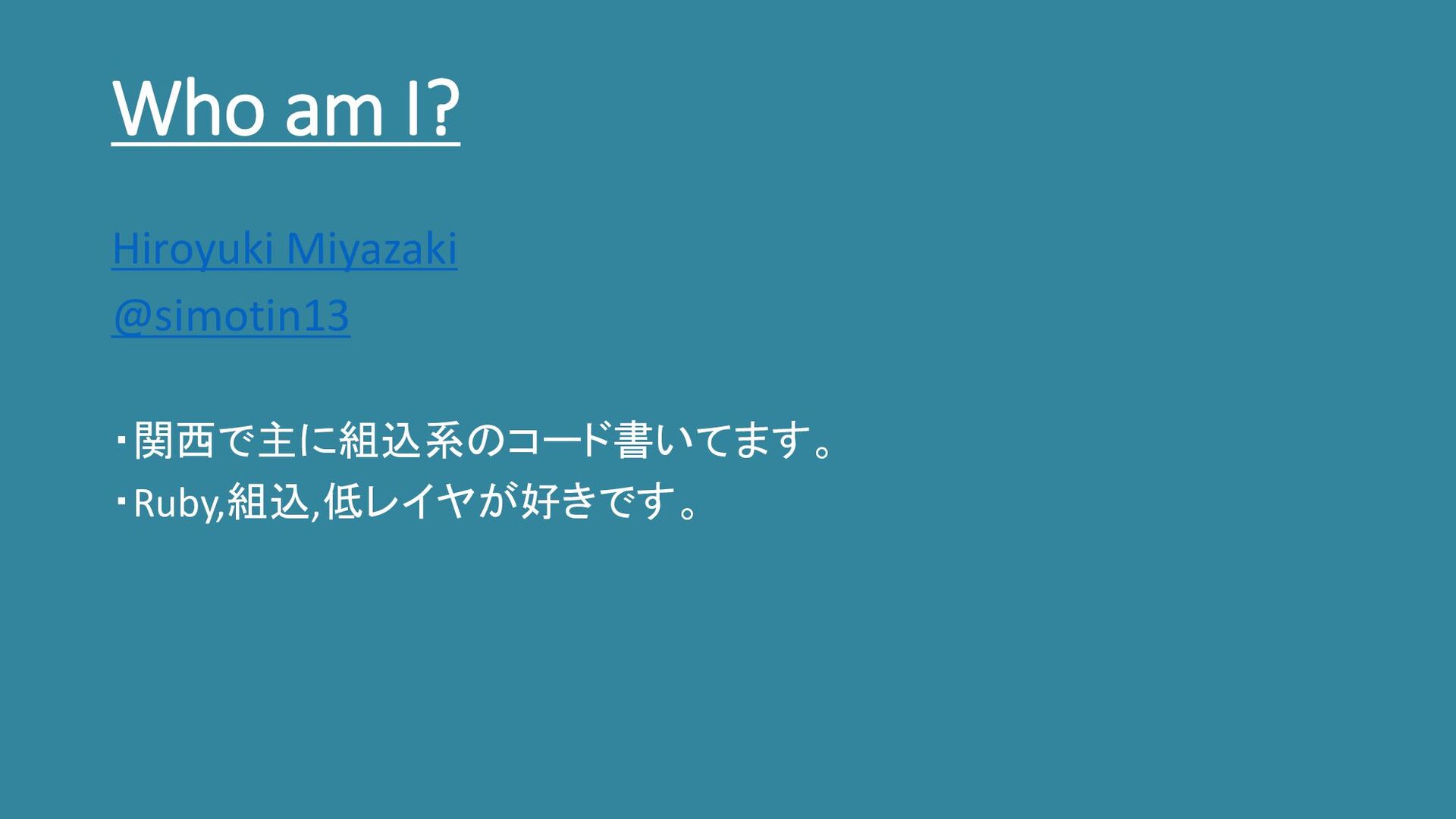 Who am I? Hiroyuki Miyazaki @simotin13 ・関西で主に組込系のコード書いてます。 ・Ruby,組込,低レイヤが好きです。