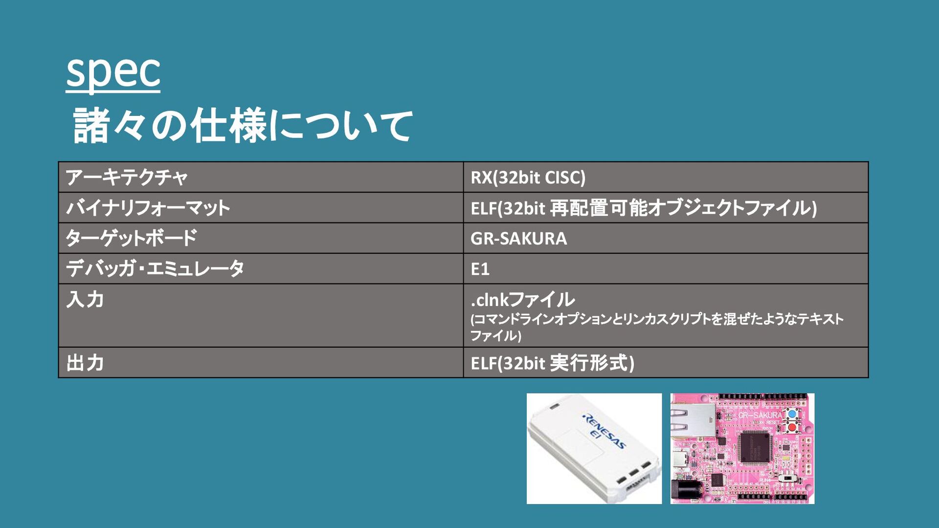 spec 諸々の仕様について アーキテクチャ RX(32bit CISC) バイナリフォーマット ELF(32bit 再配置可能オブジェクトファイル) ターゲットボード GR-SAKURA