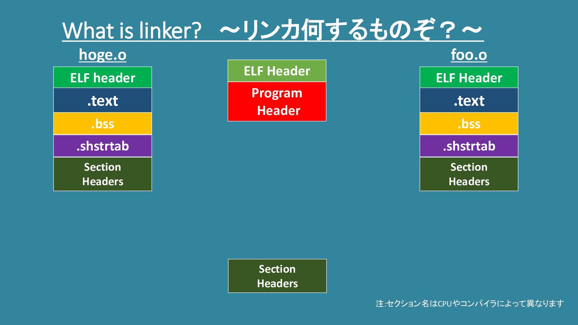 Headers hoge.o foo.o ELF Header .text .bss .shstrtab Section Headers Program Header ELF Header Section Headers 注:セクション名はCPUやコンパイラによって異なります