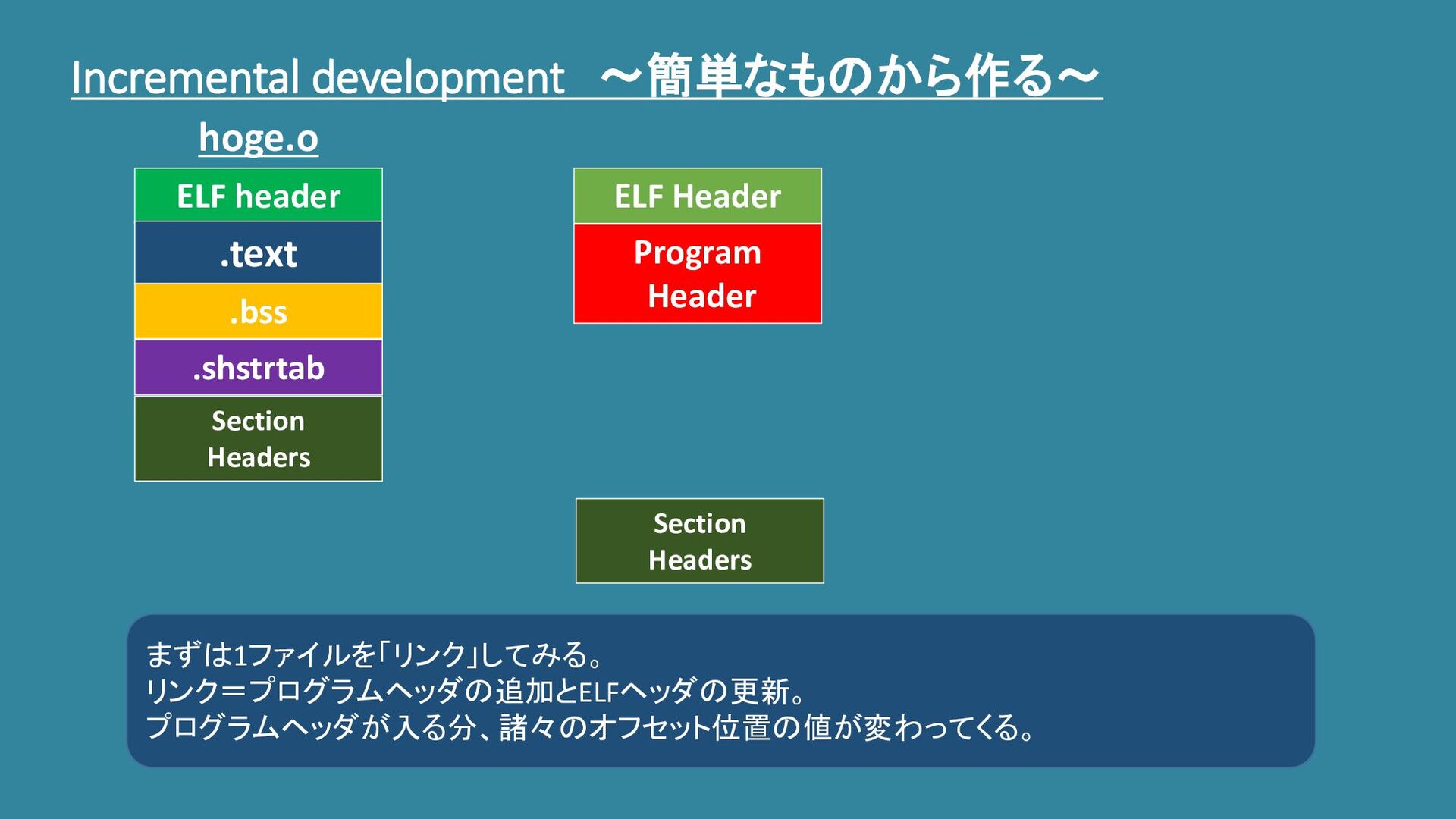 Incremental development ~簡単なものから作る~ ELF header .text .bss .shstrtab Section Headers