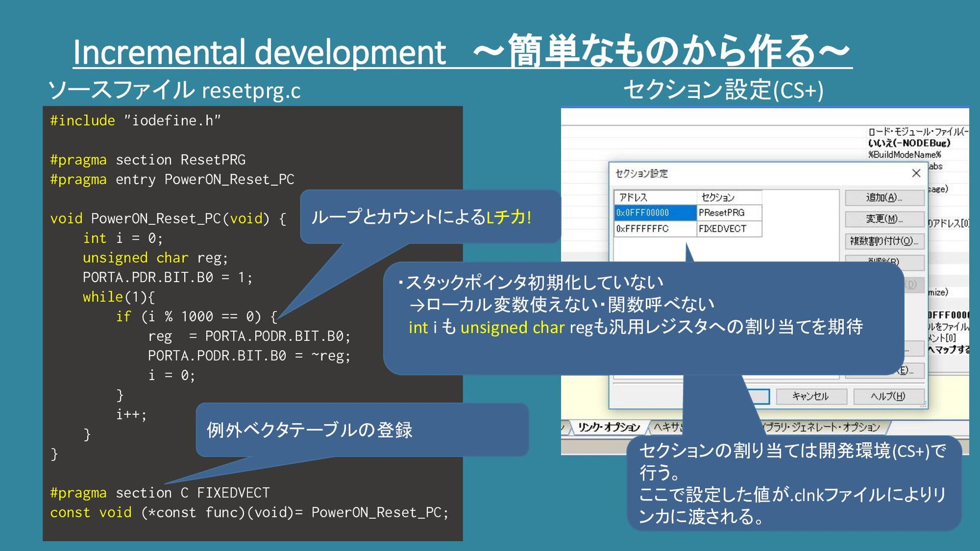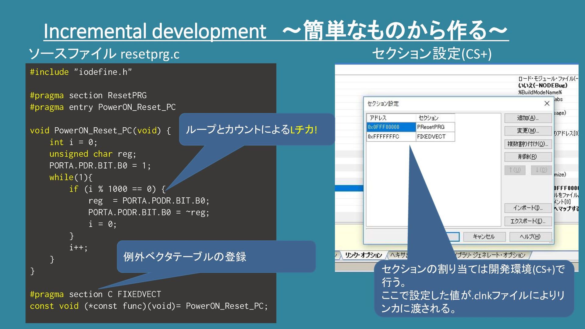 PowerON_Reset_PC void PowerON_Reset_PC(void) { int i = 0; unsigned char reg; PORTA.PDR.BIT.B0 = 1; while(1){ if (i % 1000 == 0) { reg = PORTA.PODR.BIT.B0; PORTA.PODR.BIT.B0 = ~reg; i = 0; } i++; } } #pragma section C FIXEDVECT const void (*const func)(void)= PowerON_Reset_PC; ソースファイル resetprg.c 例外ベクタテーブルの登録 セクション設定(CS+) ループとカウントによるLチカ! セクションの割り当ては開発環境(CS+)で 行う。 ここで設定した値が.clnkファイルによりリ ンカに渡される。