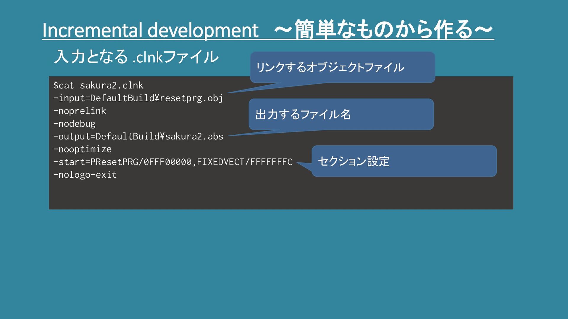 Incremental development ~簡単なものから作る~ $cat sakura2.clnk -input=DefaultBuild¥resetprg.obj -noprelink -nodebug -output=DefaultBuild¥sakura2.abs -nooptimize