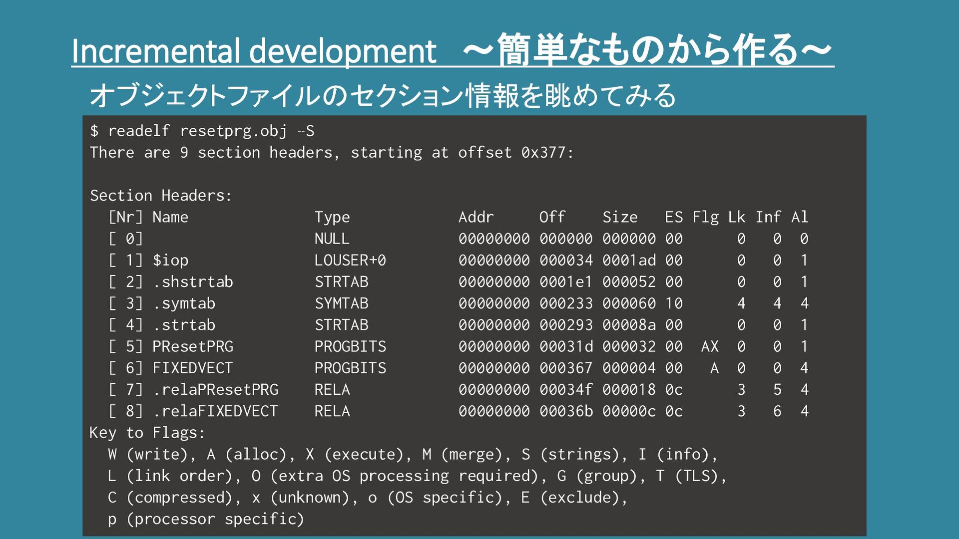 Incremental development ~簡単なものから作る~ $ readelf resetprg.obj –S There are 9