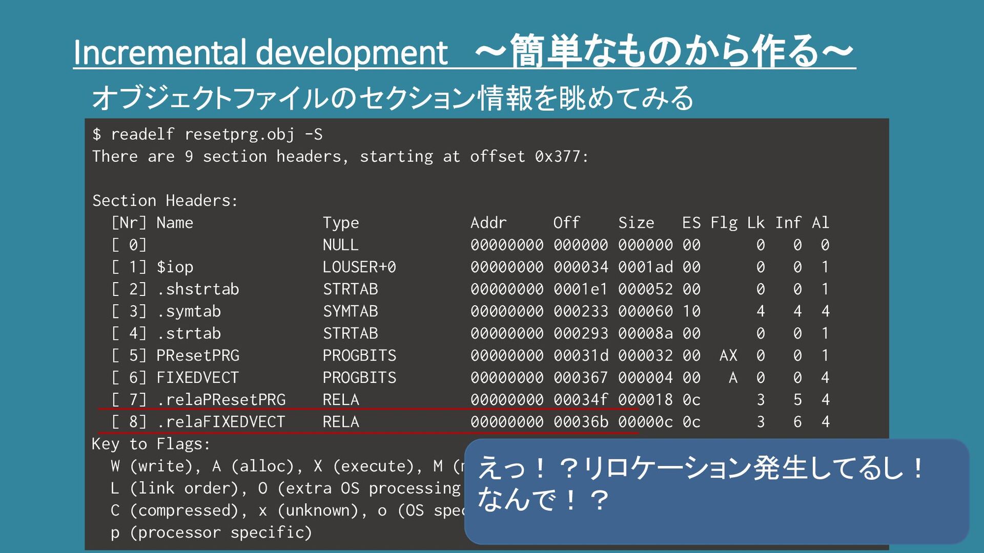 section headers, starting at offset 0x377: Section Headers: [Nr] Name Type Addr Off Size ES Flg Lk Inf Al [ 0] NULL 00000000 000000 000000 00 0 0 0 [ 1] $iop LOUSER+0 00000000 000034 0001ad 00 0 0 1 [ 2] .shstrtab STRTAB 00000000 0001e1 000052 00 0 0 1 [ 3] .symtab SYMTAB 00000000 000233 000060 10 4 4 4 [ 4] .strtab STRTAB 00000000 000293 00008a 00 0 0 1 [ 5] PResetPRG PROGBITS 00000000 00031d 000032 00 AX 0 0 1 [ 6] FIXEDVECT PROGBITS 00000000 000367 000004 00 A 0 0 4 [ 7] .relaPResetPRG RELA 00000000 00034f 000018 0c 3 5 4 [ 8] .relaFIXEDVECT RELA 00000000 00036b 00000c 0c 3 6 4 Key to Flags: W (write), A (alloc), X (execute), M (merge), S (strings), I (info), L (link order), O (extra OS processing required), G (group), T (TLS), C (compressed), x (unknown), o (OS specific), E (exclude), p (processor specific) オブジェクトファイルのセクション情報を眺めてみる えっ!?リロケーション発生してるし! なんで!?