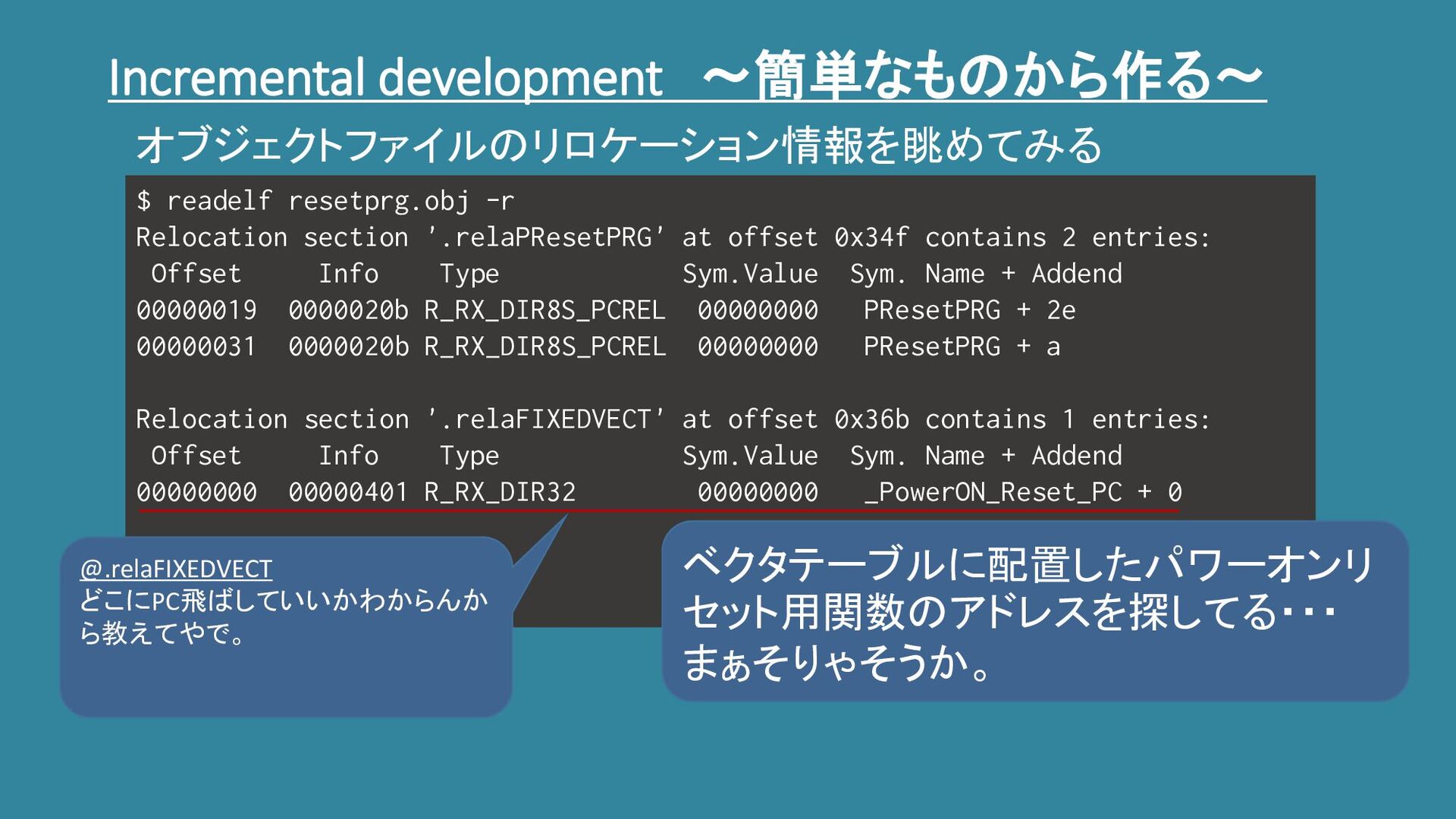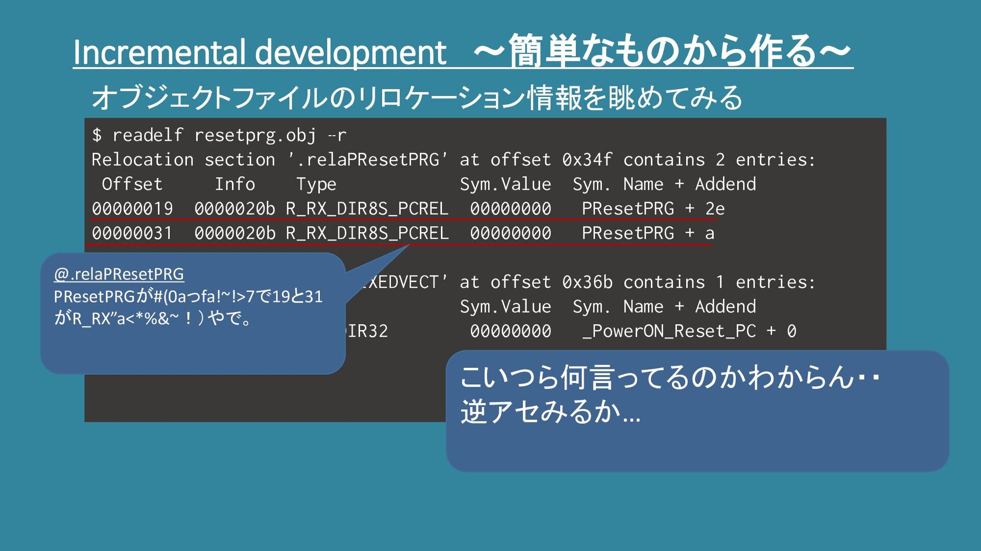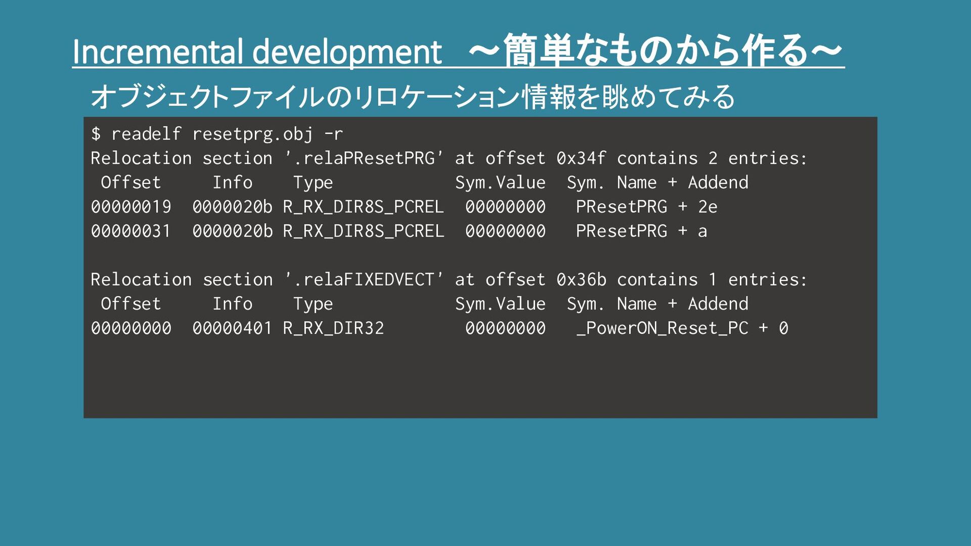 Incremental development ~簡単なものから作る~ $ readelf resetprg.obj -r Relocation section '.relaPResetPRG'